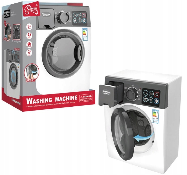 Сучасна сенсорна пральна машина, яка підсвічується, має барабан, що відкривається та обертається, і видає звуки, схожі на справжній пристрій. На дотик панель має кнопку запуску та зупинки прання.