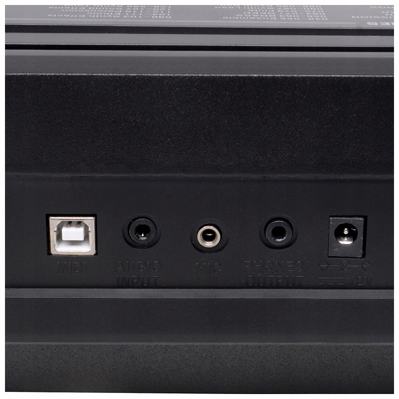 - Роз'єми: аудіовхід (роз'єм 3,5 мм ), вхід midi (USB-B), вхід для мікрофона (роз’єм 3,5 мм), вихід для навушників (роз’єм 3,5 мм), вхід живлення (DC)