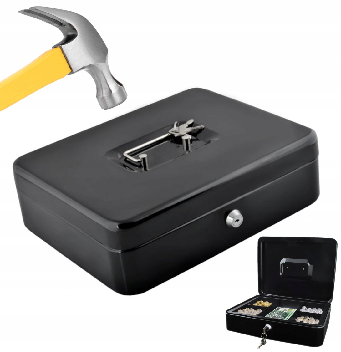 - Продукт, виготовлений із пресованого сталевого листа, лакована. Кришка, встановлена на двох внутрішніх, сильних петлях. Хромована ручка, встановлена в поглибленні кришки, дозволяє встановити кілька касет один на одного. Він має прихований простір для зберігання - верхня частина видаляється, під ним ви можете приховати банкноти або інші предмети. 4 Використання сильного патентного замку забезпечує великий захист від доступу до несанкціонованих кас (у кожній шкатулці є 2 індивідуальні клавіші, які відповідають їй лише).