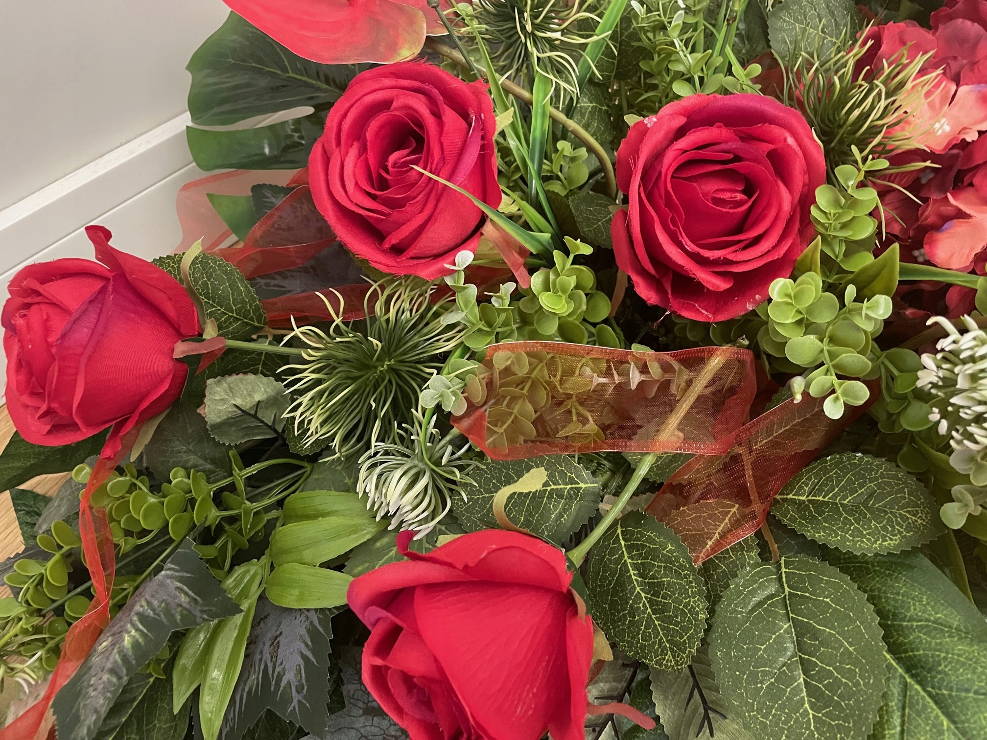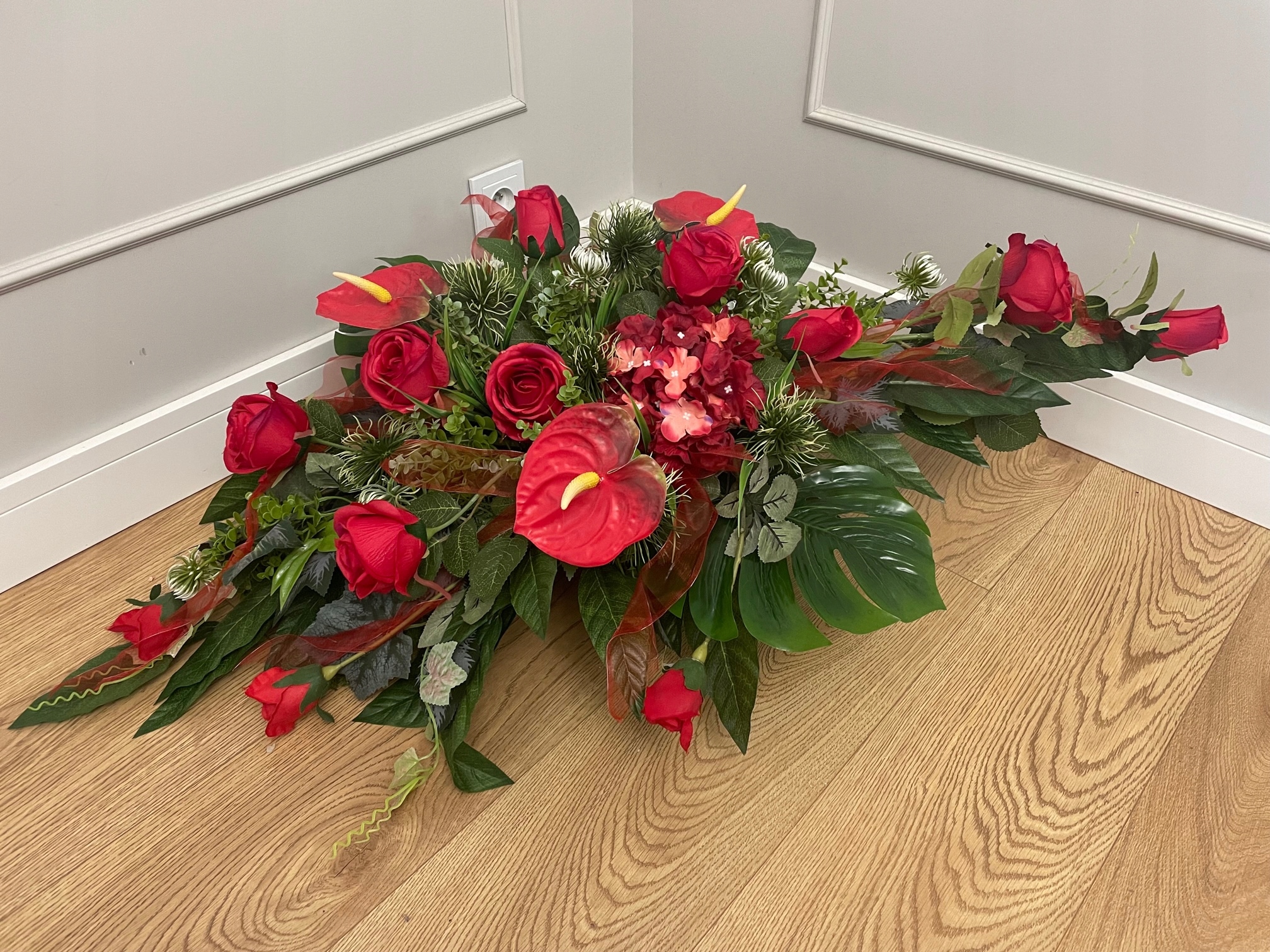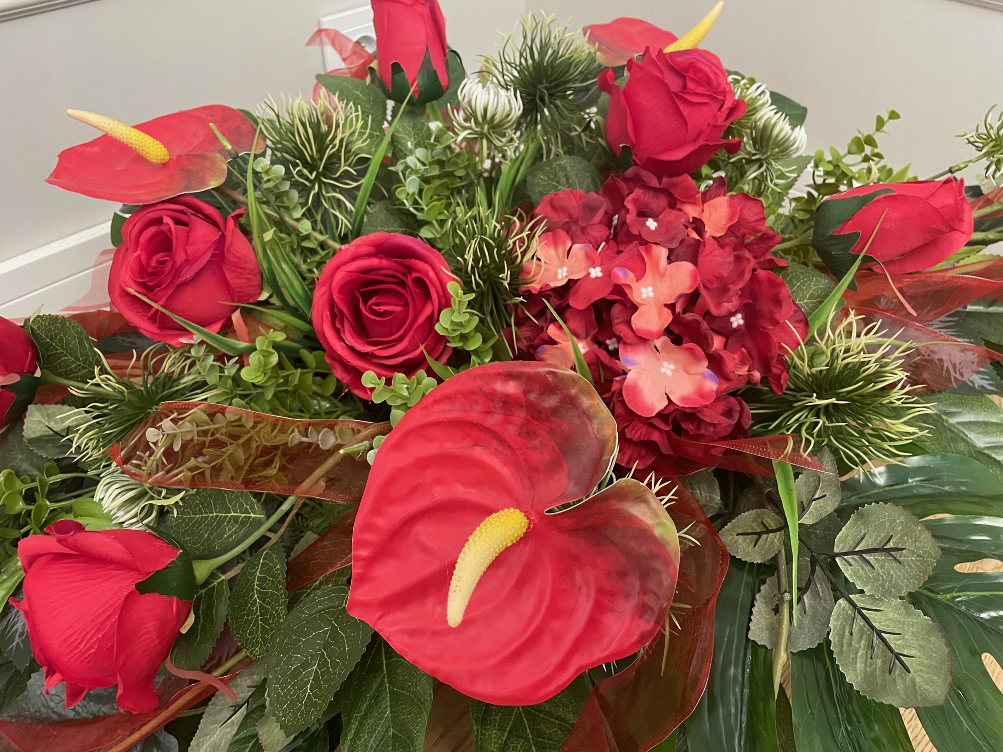 Пропозиція включає гарну композицію на будь-який сезон, виготовлену з дуже якісних штучних квітів.