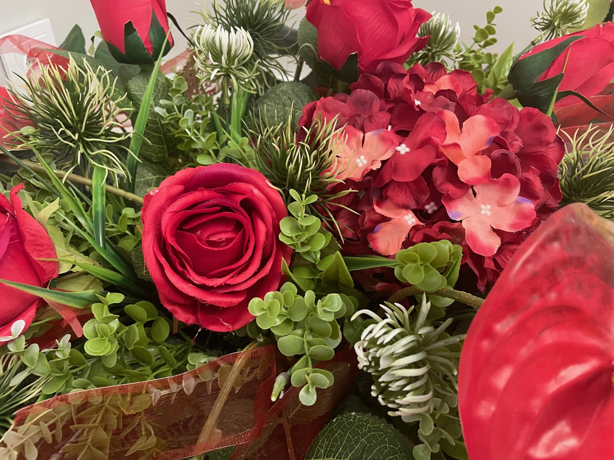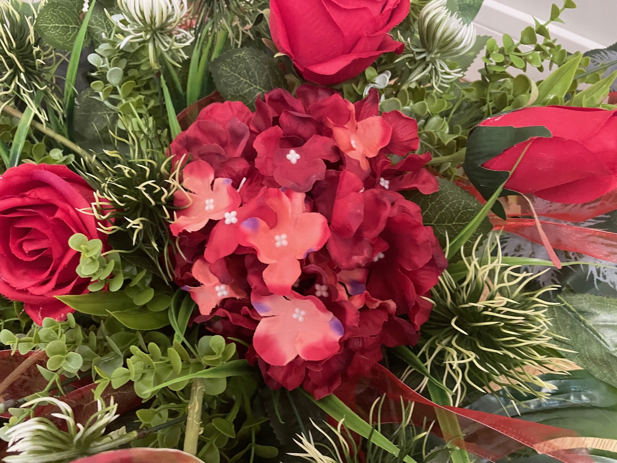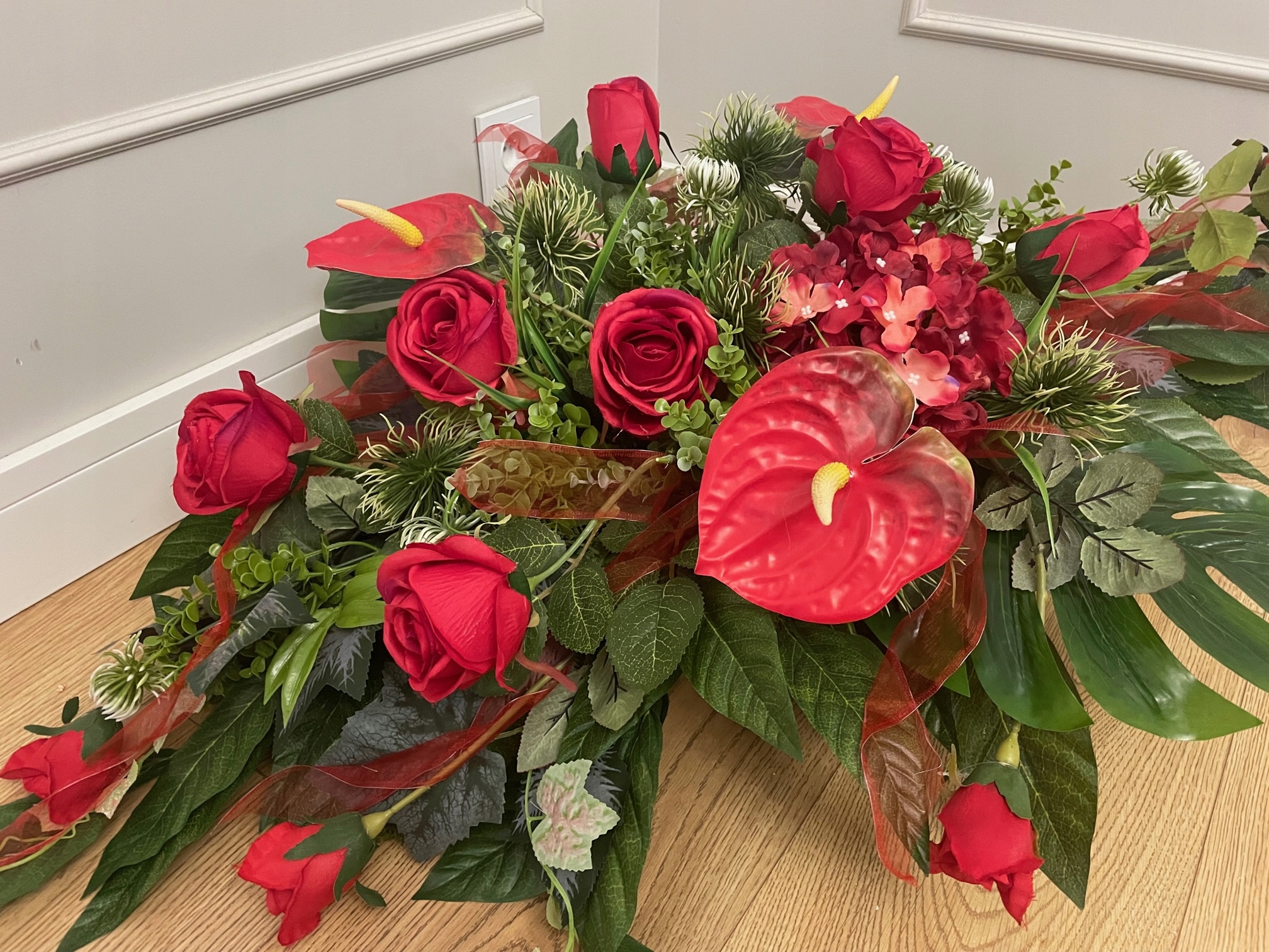 Пропозиція включає гарну композицію на будь-який сезон, виготовлену з дуже якісних штучних квітів.