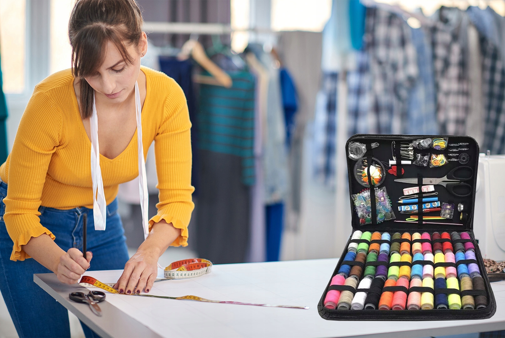 Усі необхідні аксесуари упаковані в елегантний футляр. Повний швейний набір включає інструменти для базового ремонту, включаючи швейні голки, нитки, шпильки, рулетку, ґудзики, ножиці, щітки тощо. Набір для шиття зручний і поміщається в гаманець або дорожню сумку, тому ви завжди можете мати його під рукою, коли вам це знадобиться.