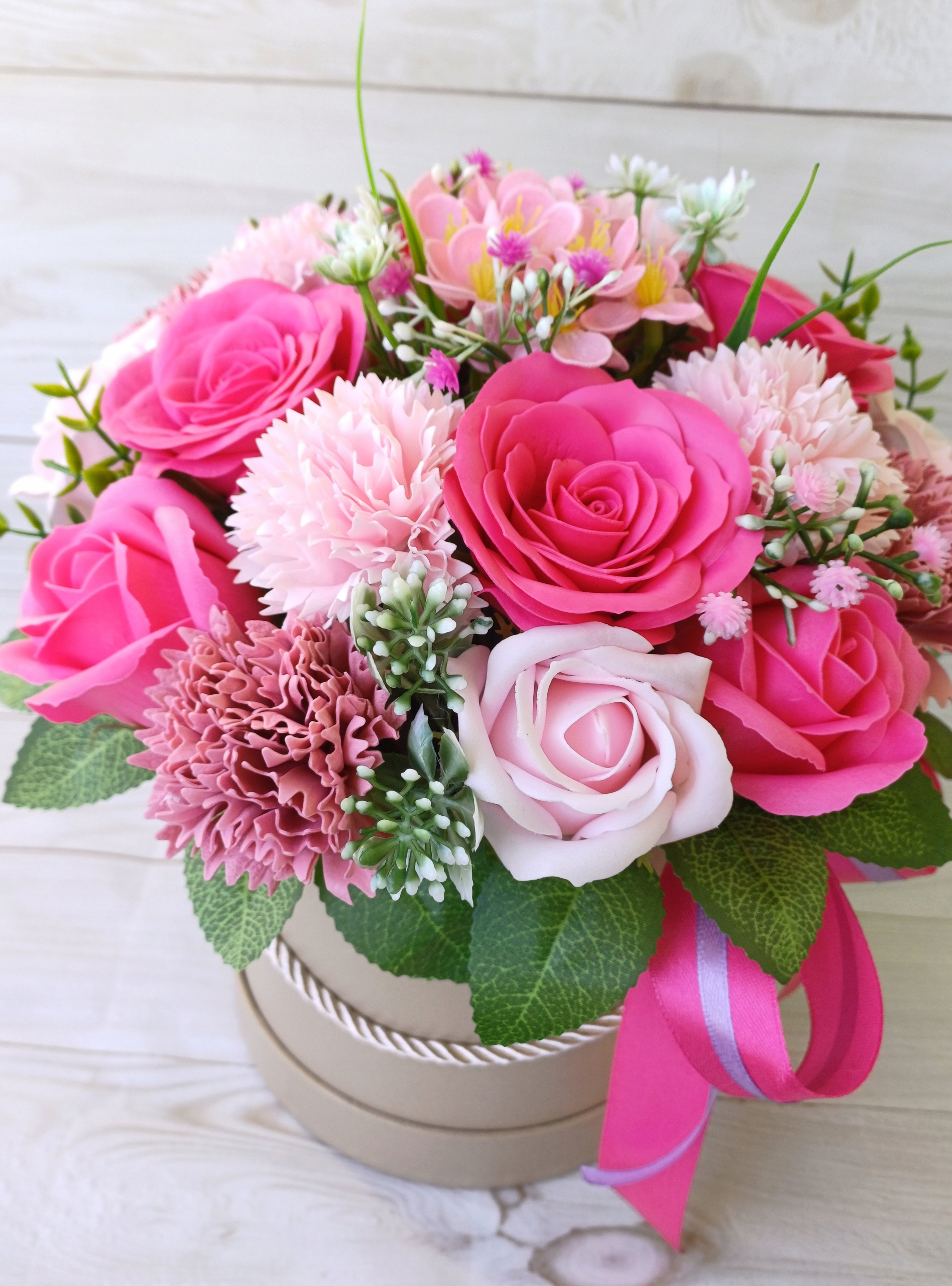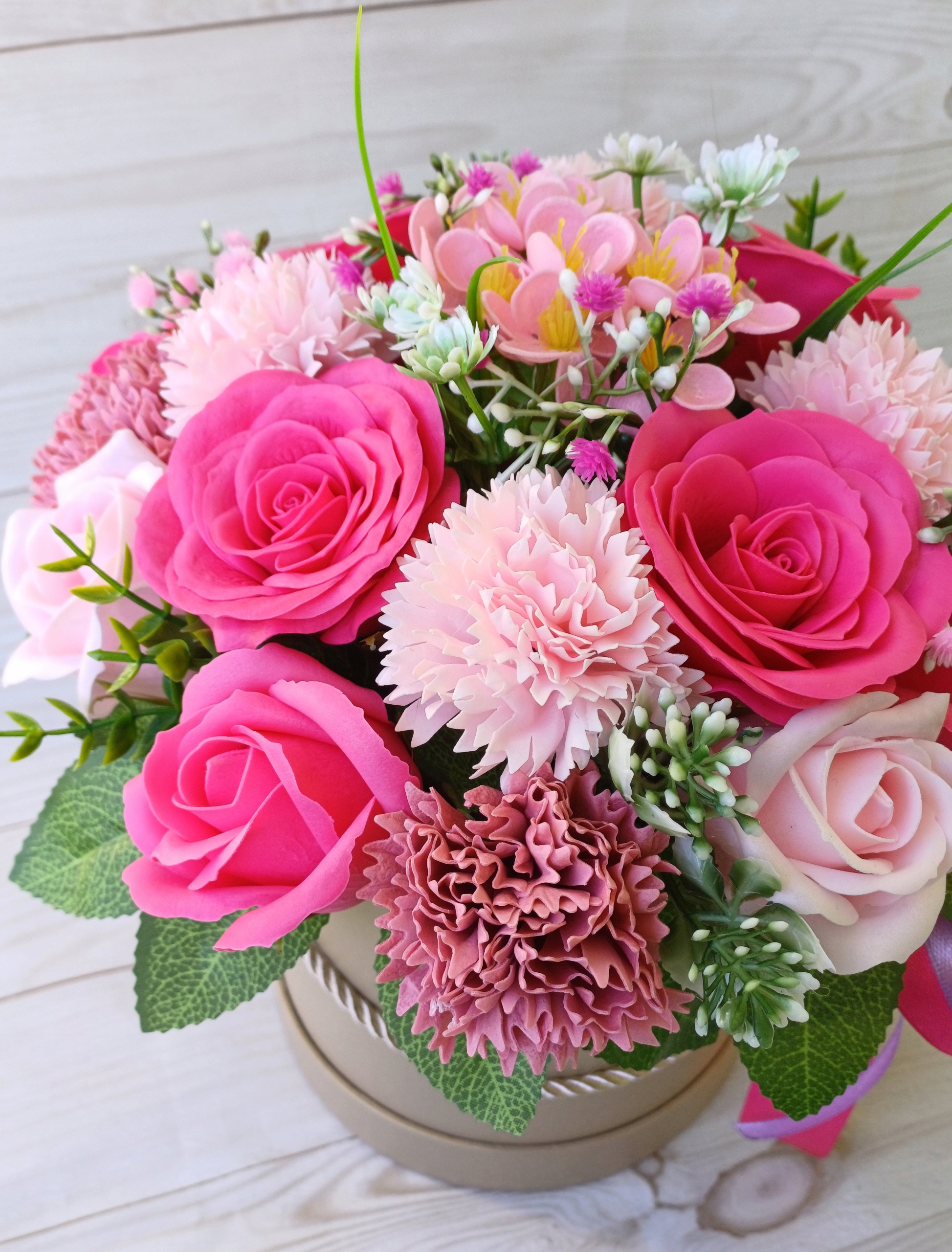 Велика квіткова коробка мила квіти троянди гвоздики для подарункового букету
