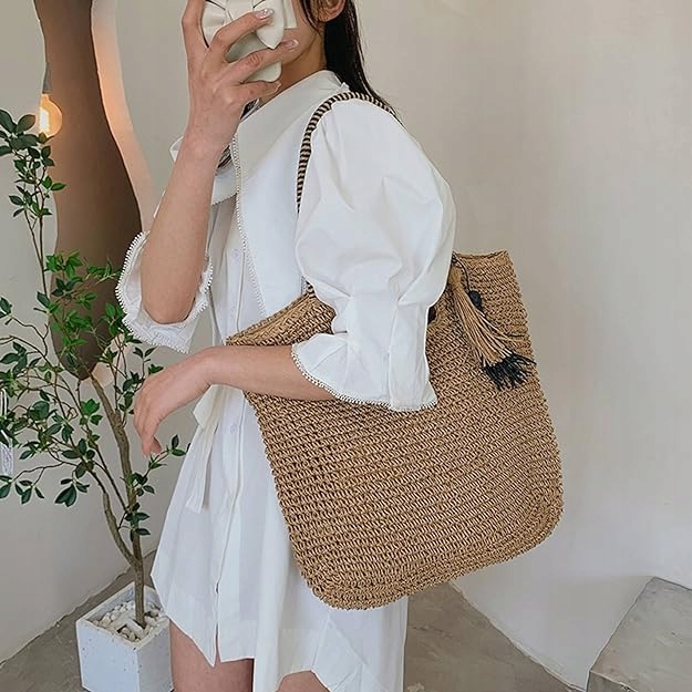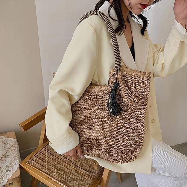 Великий літній кошик, мішок A4, заплетений весною/ літом, помпом, декоративна ручка, бахрома