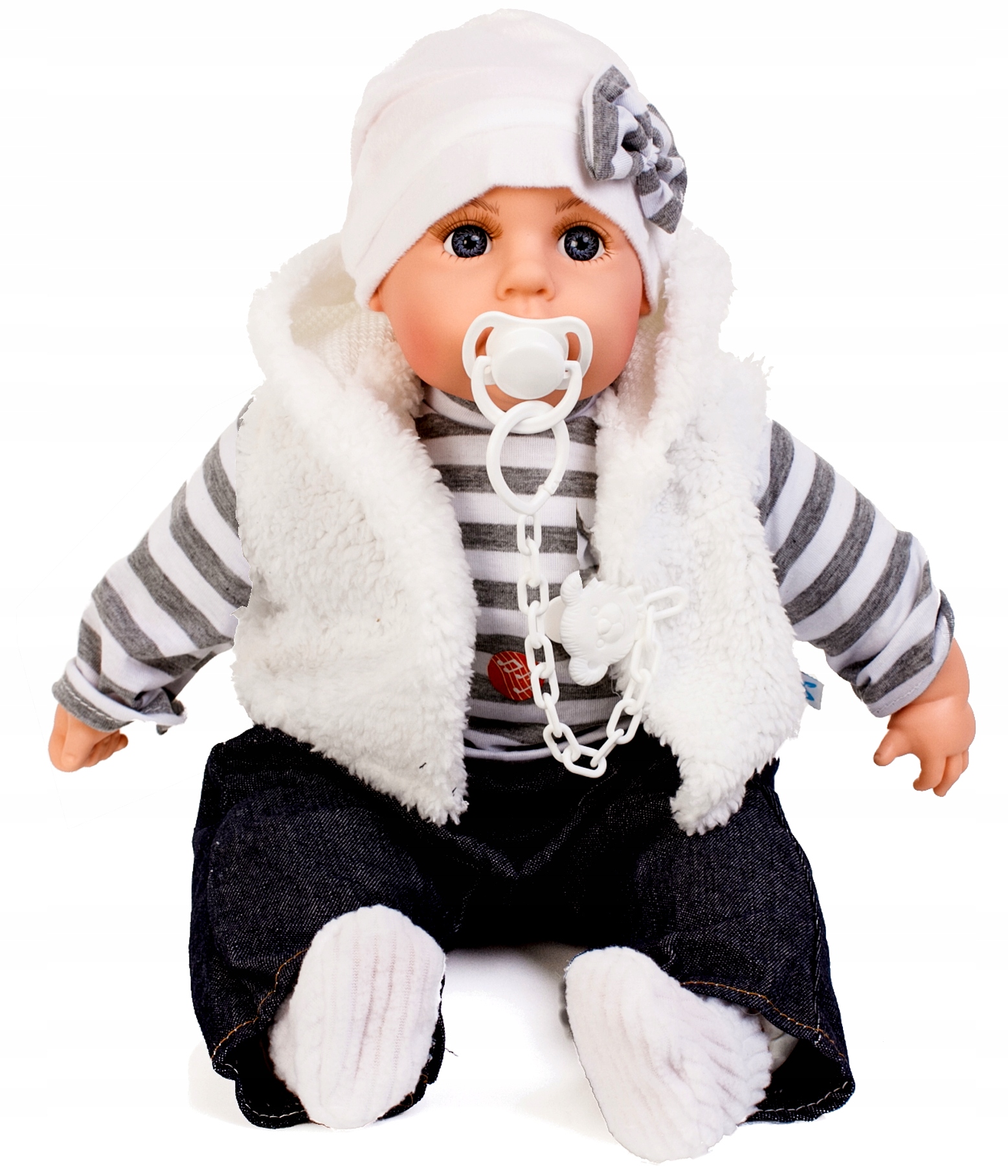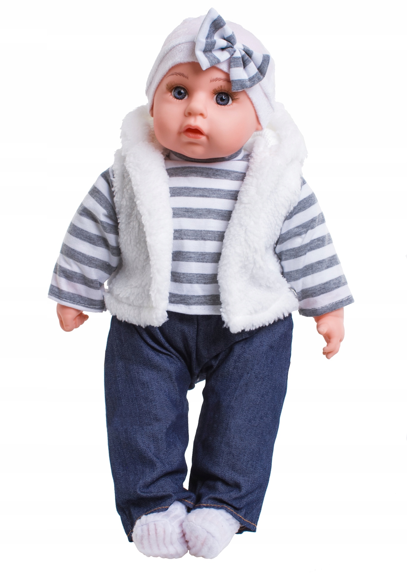 Вона одягнена в м'якебарвисте вбрання з шкарпетками та капелюхом. Одяг можна легко зняти та випратищо полегшить утримання ляльки в чистоті. У ляльки веселе миле личко і великі красиві очі.