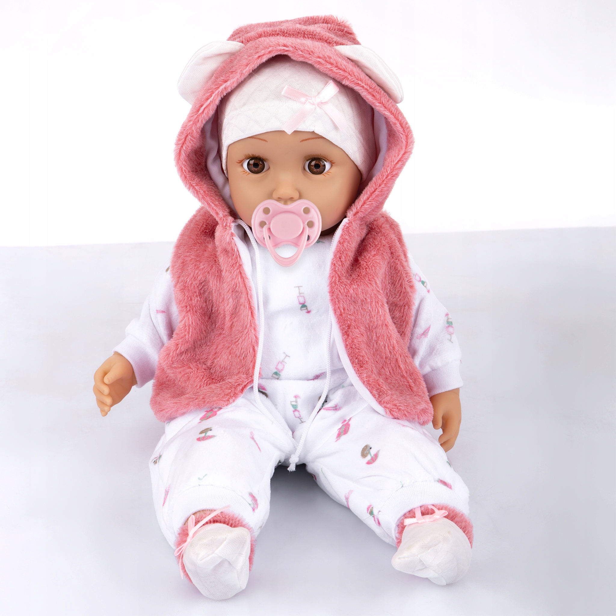 Лялька має веселе, миле личко та великі очі з веселим обличчям. Вона виглядає як справжня дитина одягнена в м'який одяг.