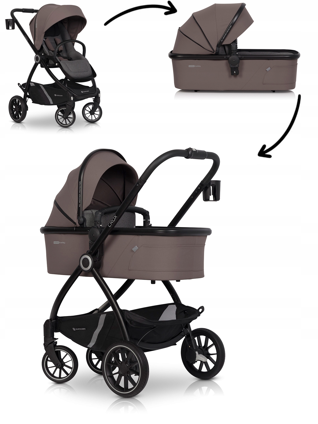 жорстка гондола crox має світло -сіру, бавовняну підкладку та дуже м'який матрац, який гарантує найвищий рівень комфорту для новонародженої дитини. У класиці коляска із запущеним сидінням.