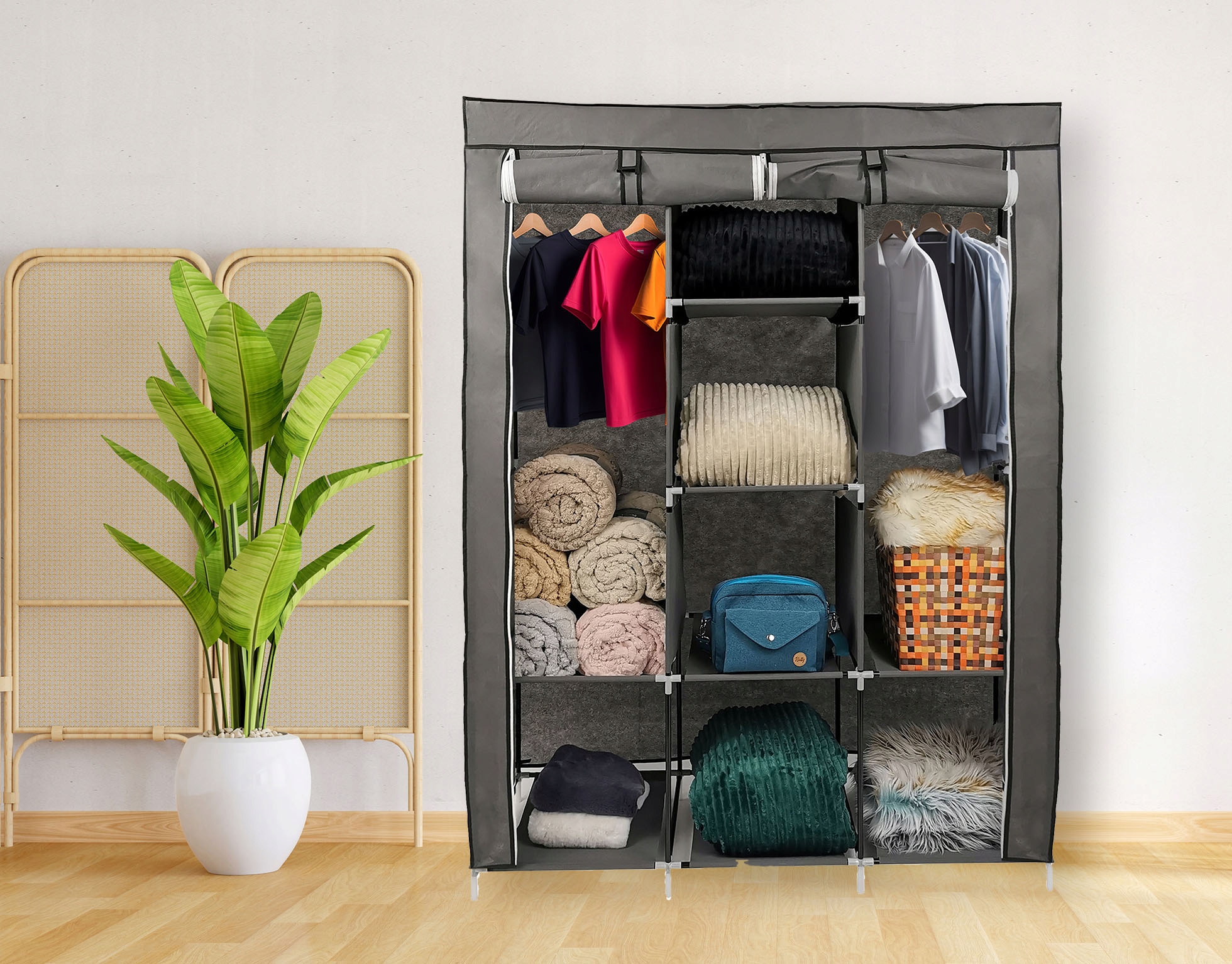 Дві дверні шторки, оснащені липучками та блискавками, ефективно захищають вміст від пилу та бруду. Решітка для одягу надійна та довговічна. Текстильна шафа виглядає стильно і підходить для різних приміщень, таких як спальня, коридор або гардеробна.