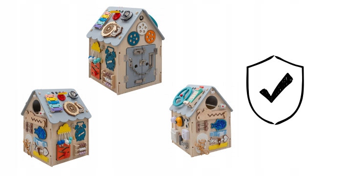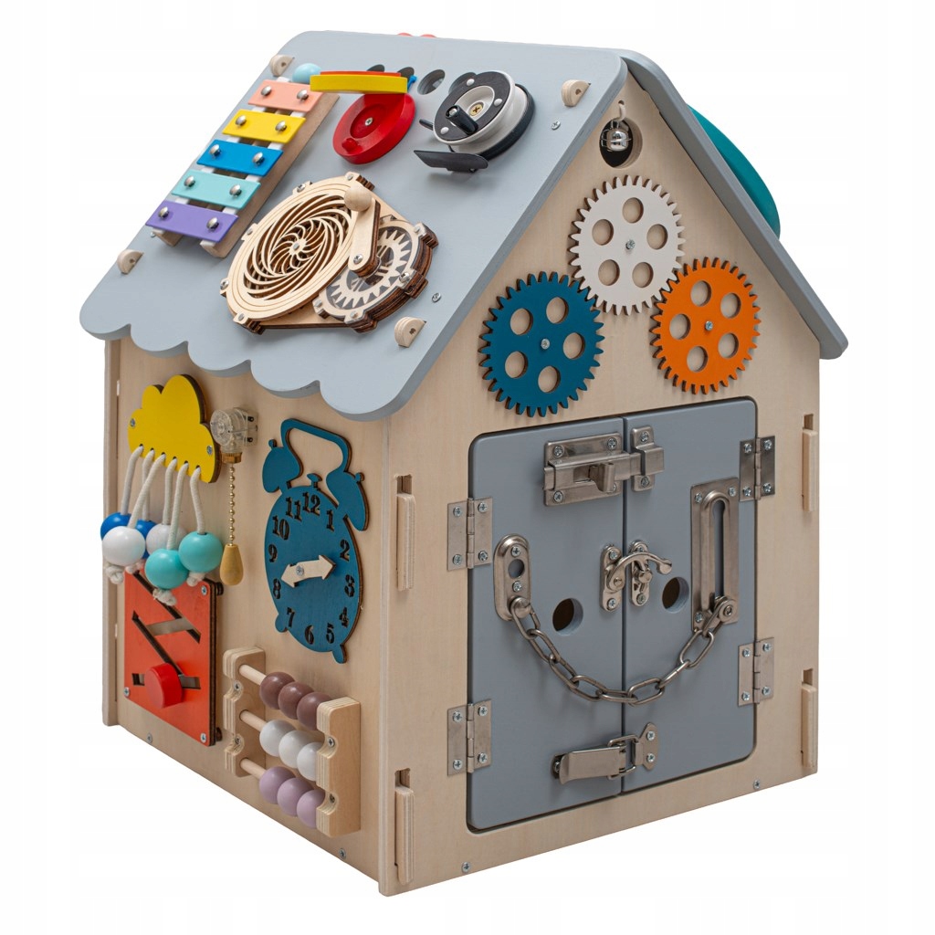 Велика маніпуляційна дошка у формі будиночка - ідеальний подарунок на Різдво або для однорічної дитини. Дитина пізнає навколишній світ через гру, безпечно знайомлячись із захоплюючими елементами навколо себе в повсякденному житті.