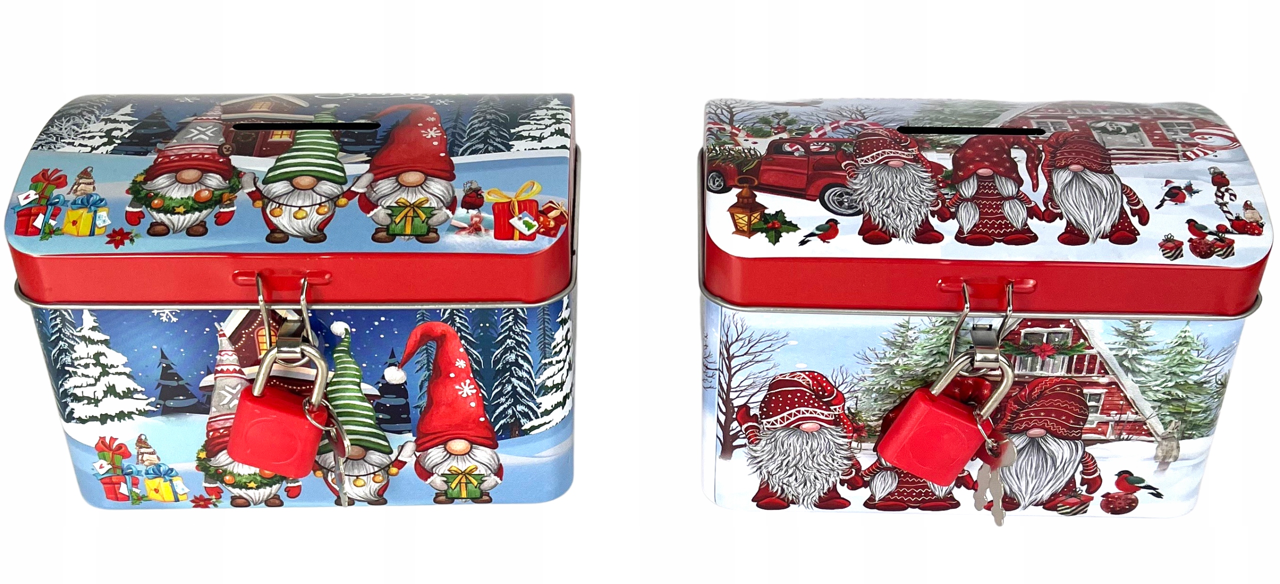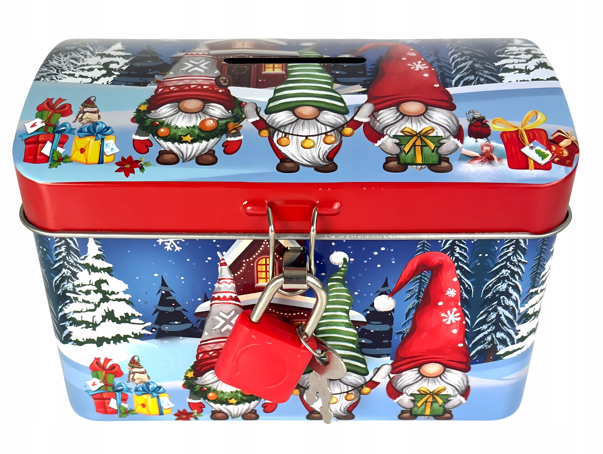 Металева коробка це має отвір для вкладання грошейвсередину та закривається на замок із 2 прикріпленими ключами, щоб у разі потреби заощадження можна буловилучити, а один із них залишити як запасний на випадок втрати . Різнобарвна банка естетично виготовлена з блискучого металу з друкованою різдвяною графікою.