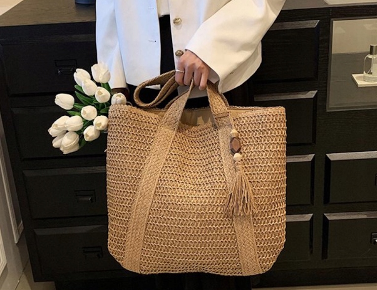 Великий літній кошик, мішок A4, заплетений весною/ літом, помпом, декоративна ручка
