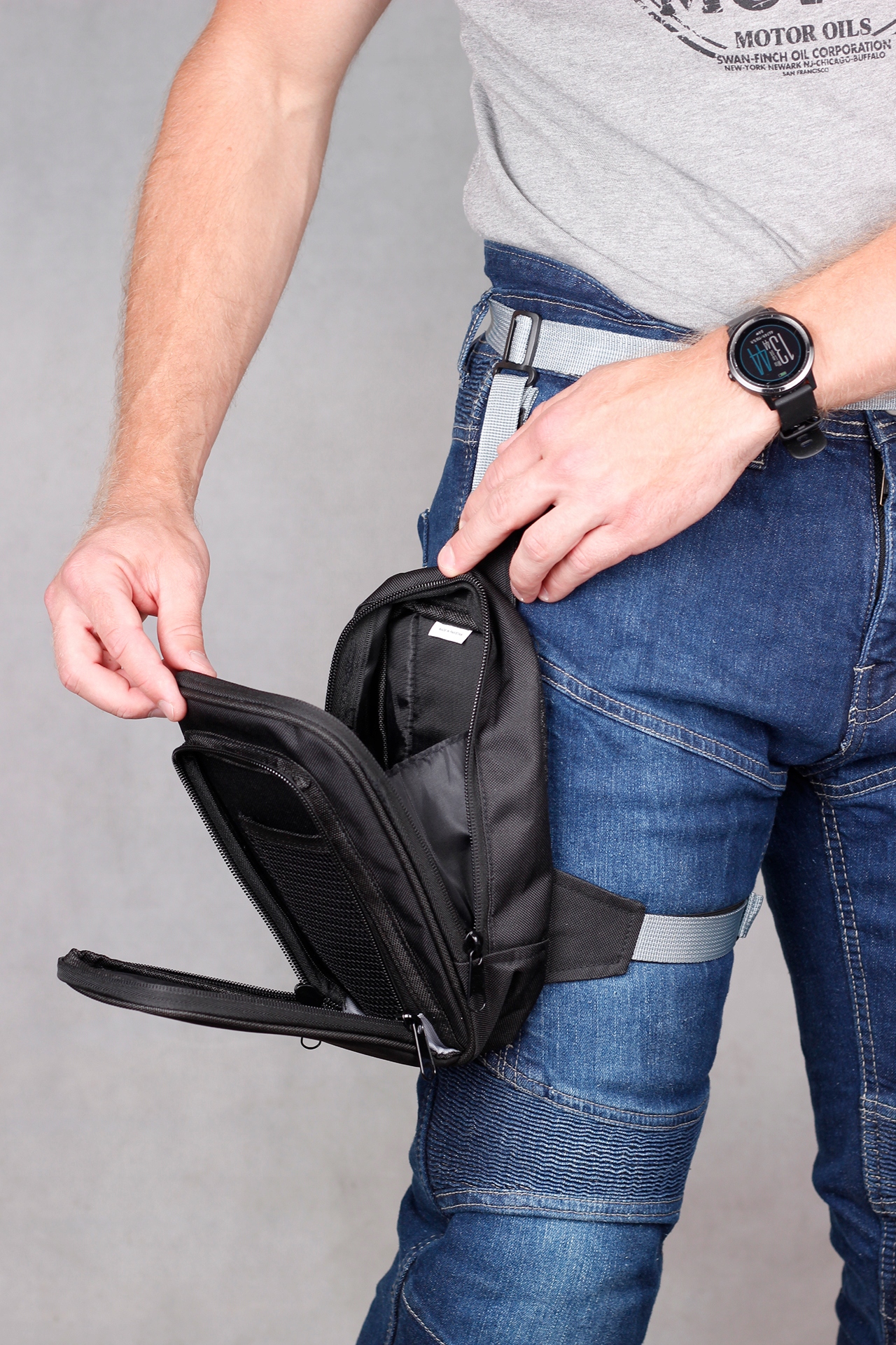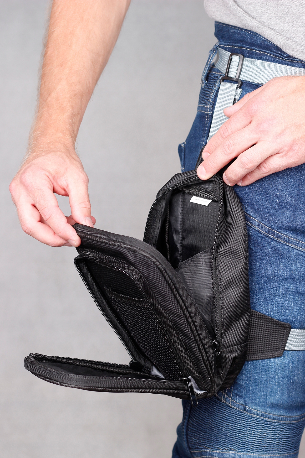 - Прогумована поверхня всередині, що стабілізує сумку на нозі