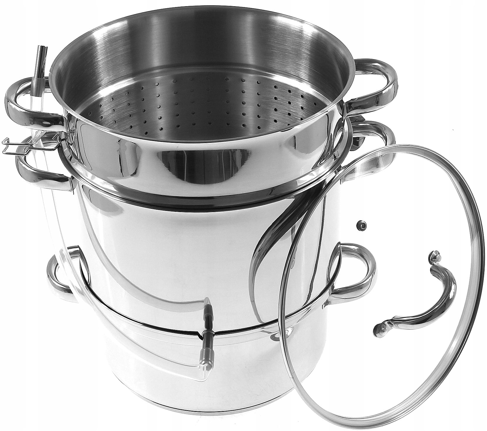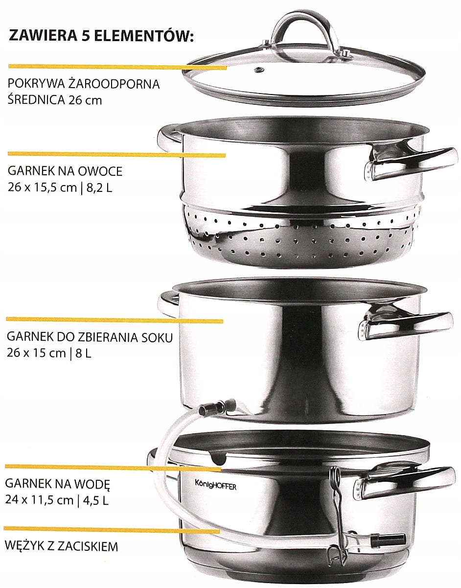 Вишня з нержавіючої сталі 5 елементів, -фруктова горщик, загальна ємність: 8,2 л 36 см, верхній діаметр: 27,5 см, нижній діаметр: 24 см, висота: 16 см, - сік, що збирає горщик, загальна ємність: 8 л, ручки: 36 см, верхній діаметр: 27,5 см, нижній діаметр: 26 см, висота: 15 см, горщик: Потужність: 4,5 л: Висота: висота: висота Ручки: 34 см, верхній діаметр: 26 см см, висота: 12 см, - скляна кришка, діаметр: 26 см, висота: 2 см, - шланг із затискачем, довжина: 42 см, діаметр отвору: 1 см.