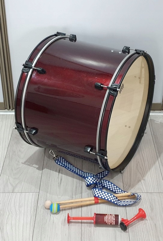 Включає ремінь, дві палички та нову трубу для підбадьорювання та ключ для налаштування барабана.