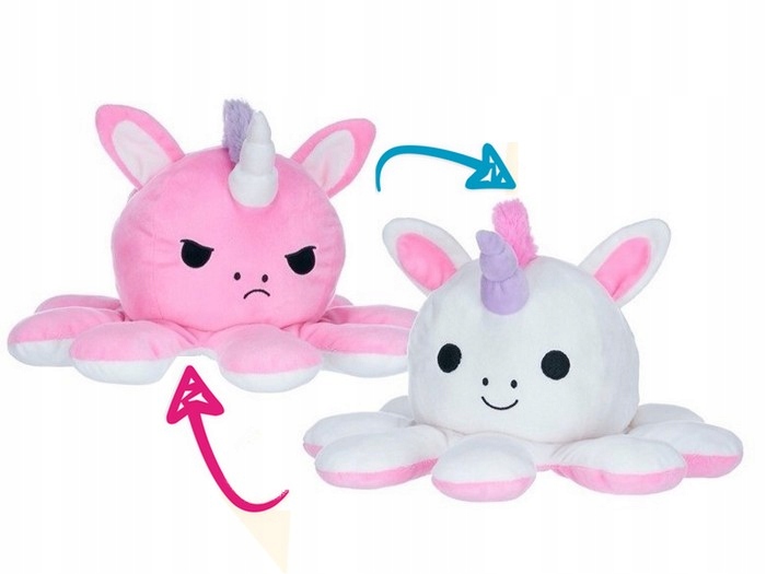 Оборотний дизайн дає змогу перевертати плюшеву іграшку-однорога-восьминога, щоб побачити інший колір і посмішку (білу) або насуплене обличчя єдинорога (рожеву).