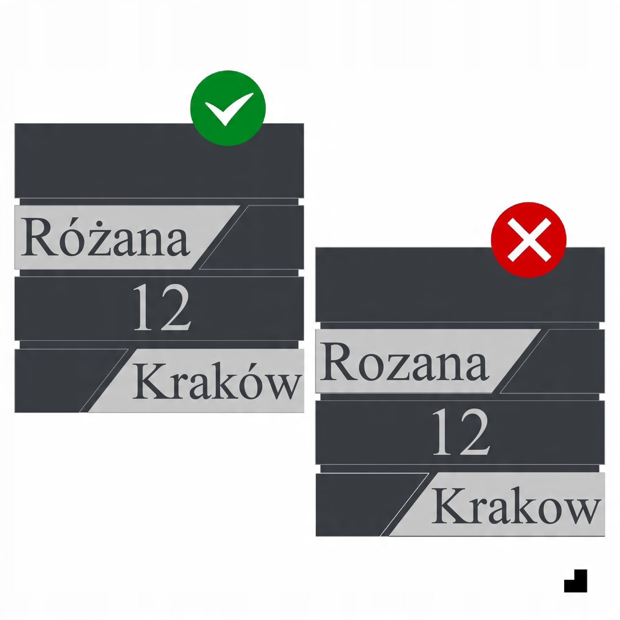 - Ми наполягаємо на використанні польських символів: ą, ć, ę, ł, ń, ó, ś, ź, ż, під час надання адреси, яка має бути на табличці.