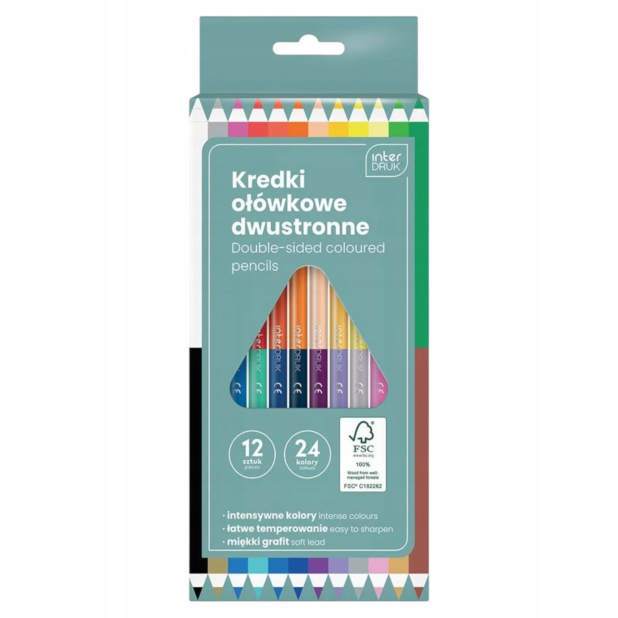 - КОлівці двосторонні Інтердрук - сучасний барвистий художній інструмент для учнів 1-8 класів. Це 12 ергономічних олівців, які пропонують до 24 яскравих кольорів, що ідеально підходить для малювання, розфарбовування та шкільних проектів. Трикутний переріз забезпечує зручне захоплення та формує правильну поставу руки.