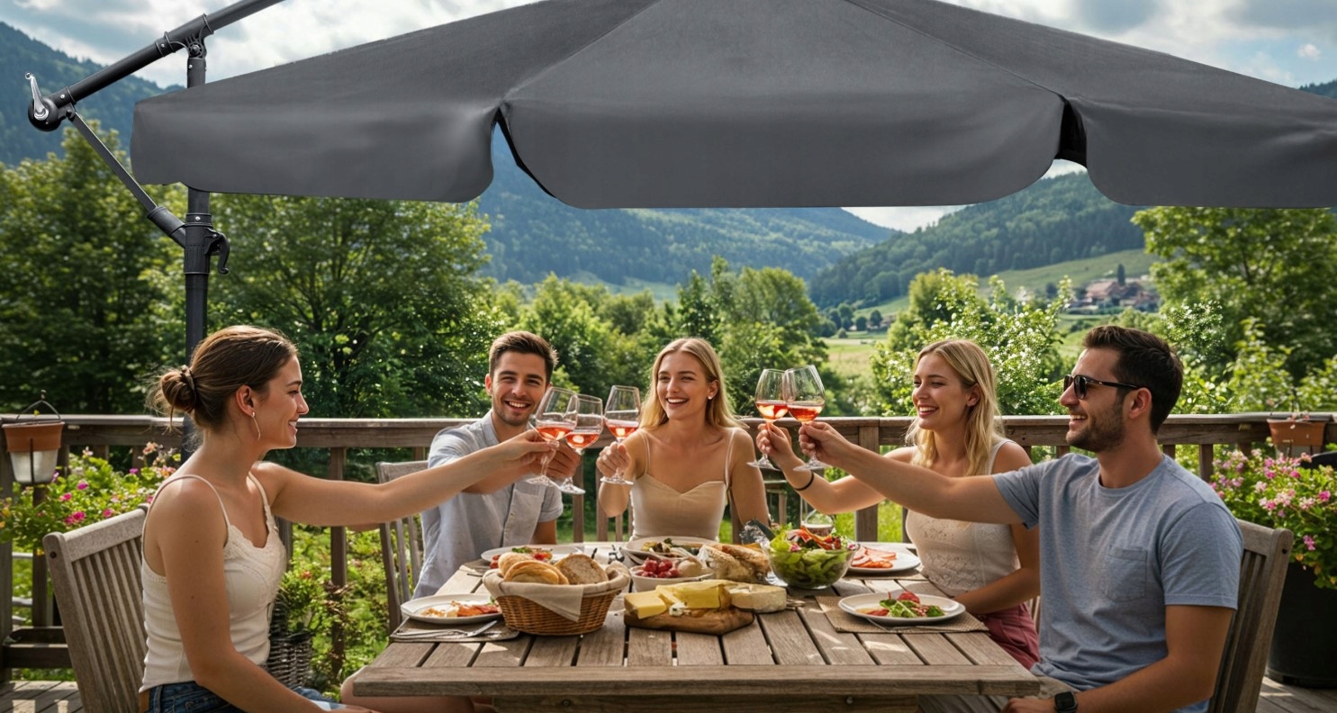 Завдяки великій поверхні навісу (до 3,5 метрів після матеріалу) Парасолька забезпечує ефективне покриття проти УФ -променів та опадів. Виготовлений з густо плетеного поліестеру 180 г/м² , матеріал не тільки захищає від сонця, але й водонепроникний - ідеально підходить для зміни погодних умов.