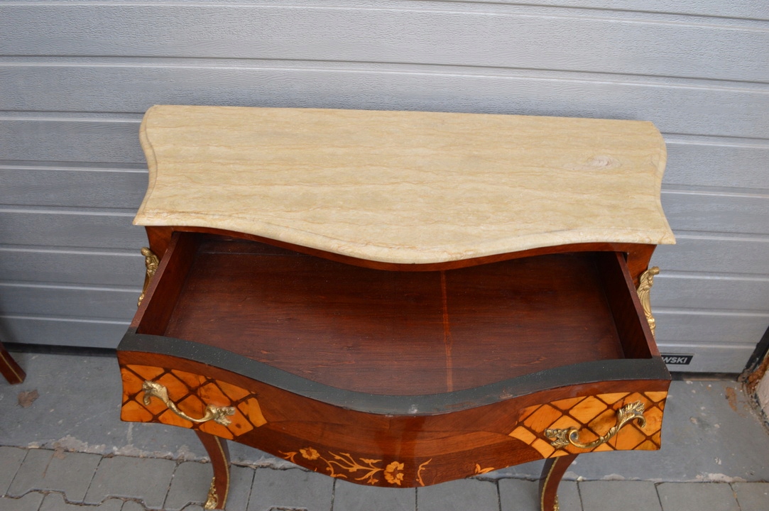 Предметом сьогоднішнього аукціону є неймовірно красивий інкрустований комод, багато прикрашений латунною фурнітурою, яка додає чудового шарму предмету меблів.