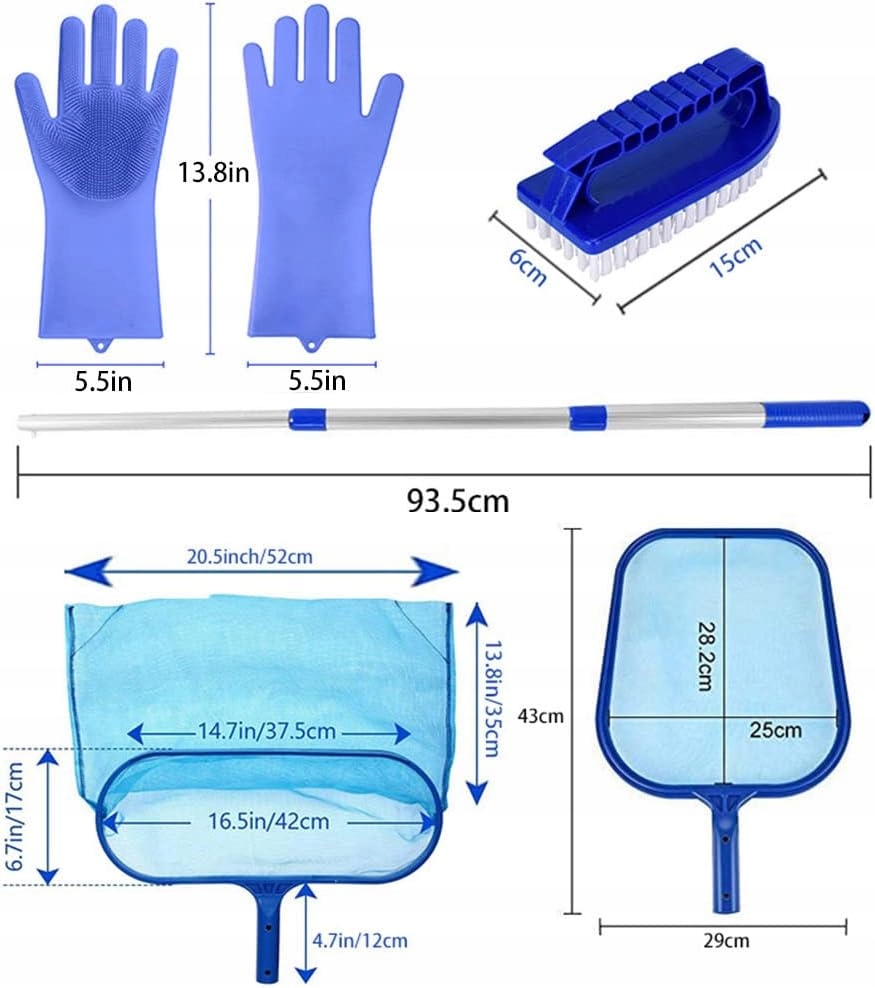 Набір містить усе необхідне: висувну жердину, сітку для листя, щітку та рукавички. Це функціональний набір, який добре працюватиме як у великих басейнах, так і в невеликих водоймах.