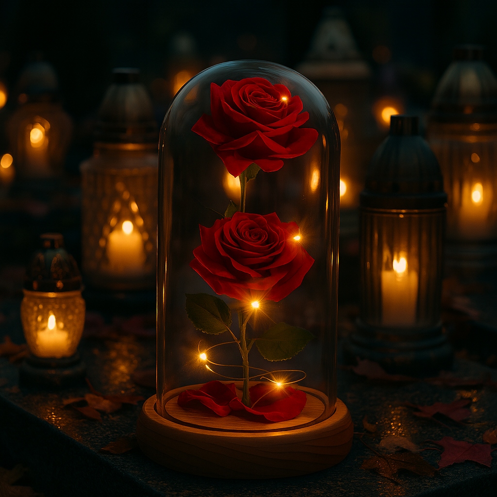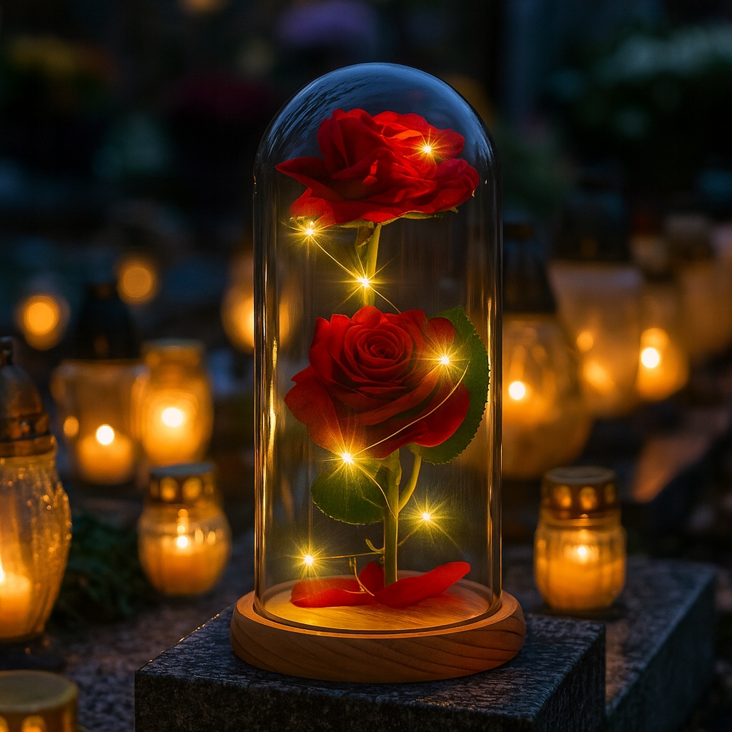 Ми пропонуємо унікальну Вічну троянду у склі - елегантну свічку з квіткою та світлодіодним світлом. Він не в'яне, не потребує догляду, а його тепле сяйво створює атмосферу пам'яті та любові. Ідеально підходить на могилу близької людини або як символічний подарунок.