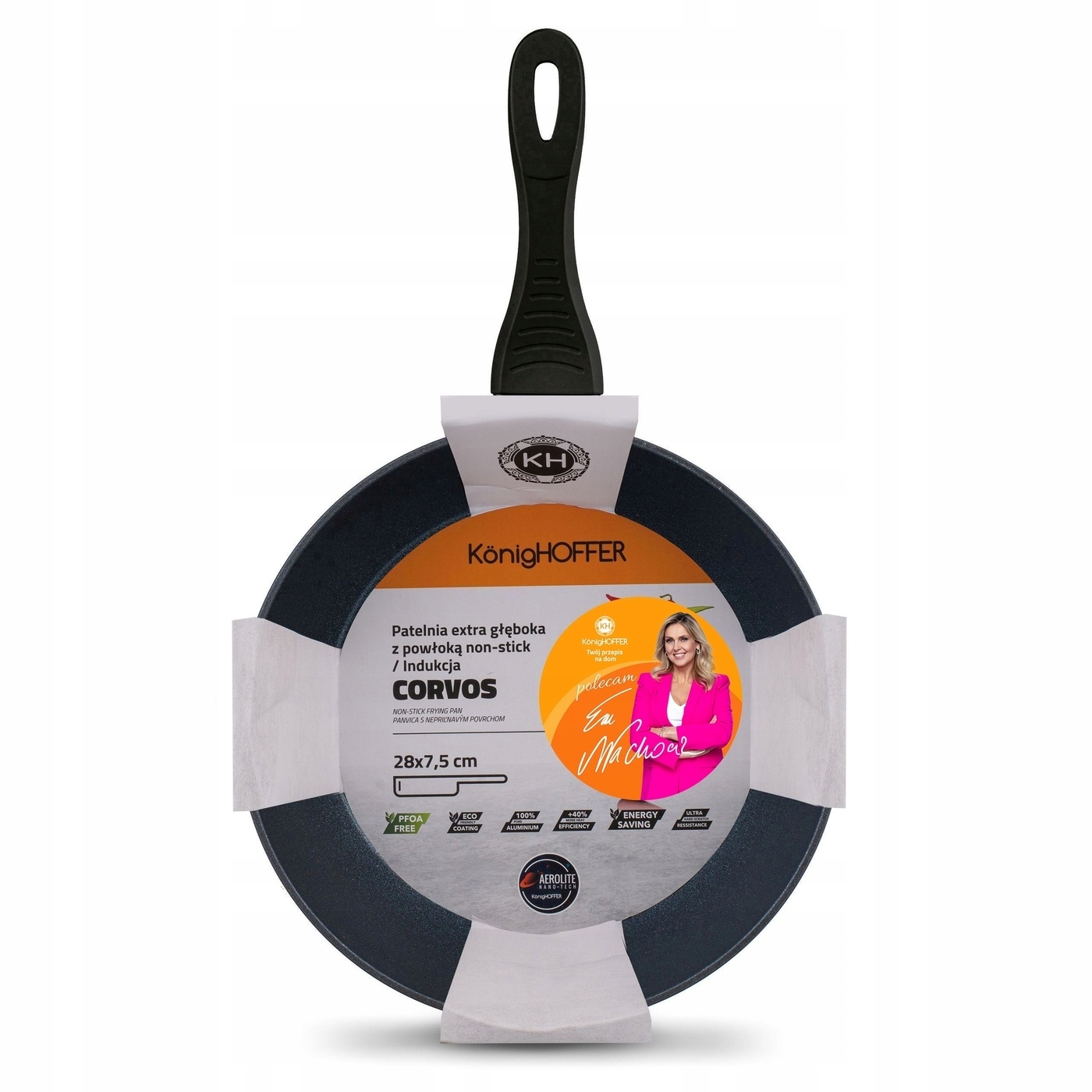 Корвос з глибоким смаженням Konight Corvos 28 x 7,5 см може використовуватися на індукції та газових, керамічних та електричних печах. Її алюмінієвий корпус було вирізано гарячим. Завдяки цьому він добре збалансований, важкий і має суцільні стіни. Він також має значно більшу міцність до високої температури та пошкодження. Нормолітне аеролітне покриття (50-65 мікрометрів) було спеціально збагаченим і не містить PFOA. Це також важче, ніж стандартні 2-шарові покриття для запобігання прилипання та спалювання інгредієнтів. Його сила досягає 50 000 циклів стирання - один з кращих результатів у глобальному масштабі. На сковороді Corvos ви будете смажити те, що хочете, у невеликій кількості вершкового масла або оливкової олії. Ви працюєте комфортно і миєте продукт. Сучасний дизайн зі смаком збагачує вашу кухню - це простий спосіб зробити комфорт створення дієти та легко засвоюваних страв. М'яка дотик ручки покрита шаром силікону і має поверхню, що не має слизу. Його дизайн не нагрівається і добре захищає від опіків. Продукт має рекомендацію Ewa Wachowicz. Як посол Konighoffer, вона рекомендує його для домашнього використання з посмішкою. Ви отримаєте з ним свій домашній рецепт. Це один з найкращих варіантів цієї категорії!