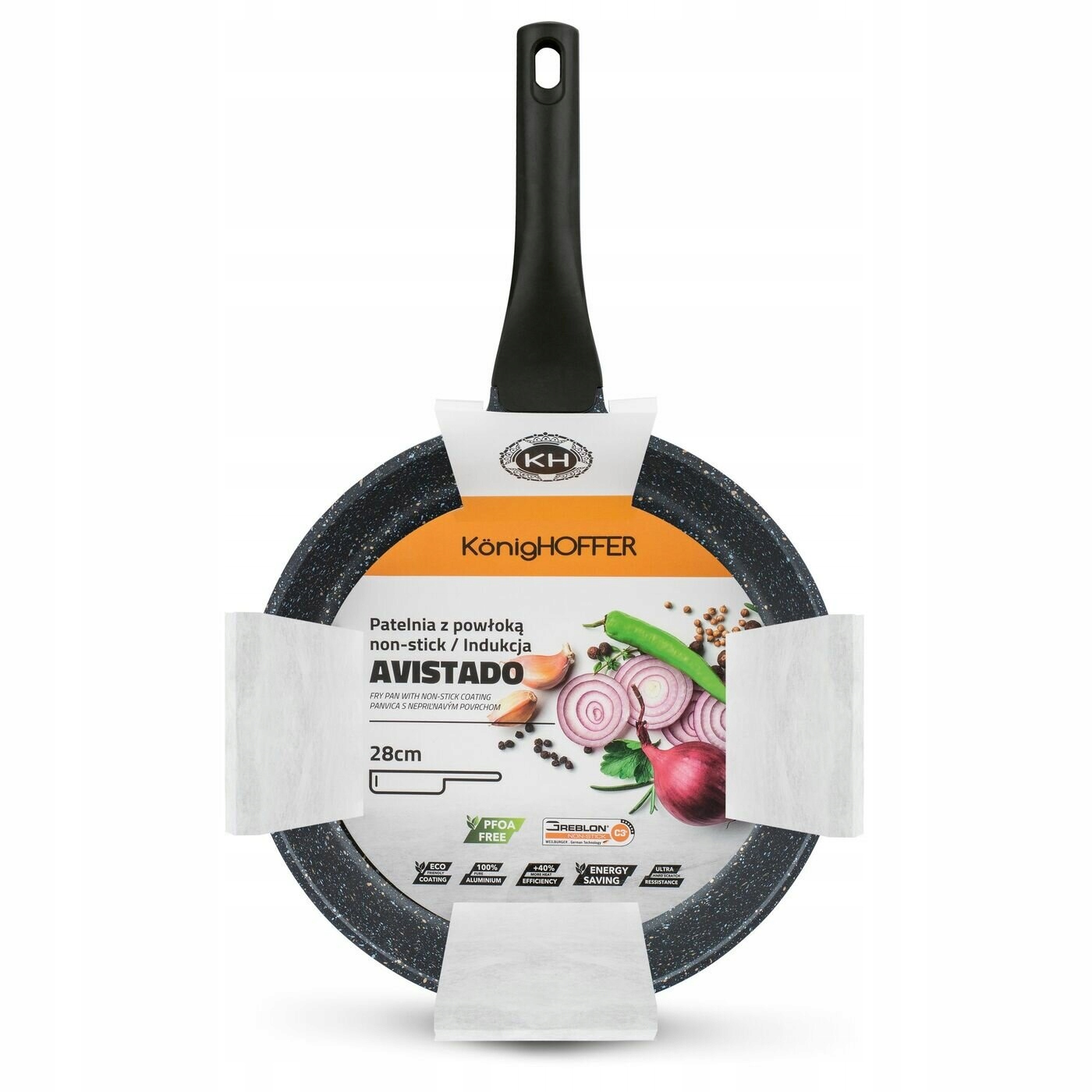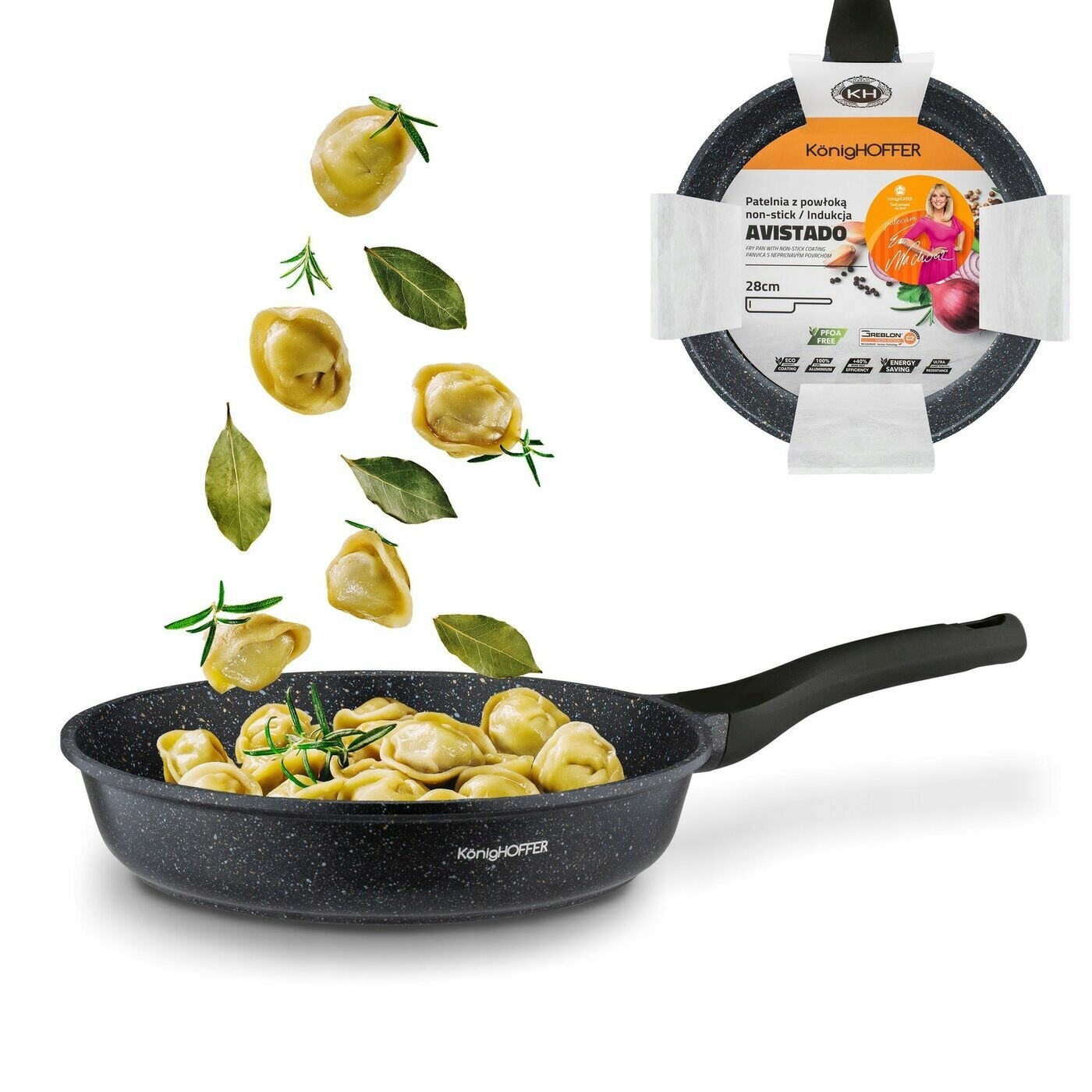 Мармурова індукційна сковорода Konighoffer Avistado 28 см виготовлена з алюмінію. Для його створення використовувалася техніка однорідного лиття під тиском. Завдяки цьому він ідеально збалансований і дуже міцний з точки зору механічних і термічних властивостей. Всередині сковорода покрита німецьким антипригарним покриттям GREBLON C3+. Його висока якість, твердість і 3-шарова структура, що імітує візерунок граніту, були розроблені компанією WEILBURGER. Він також позначений як PFOA Free. Енергозбереження забезпечує індукційне дно. Завдяки цьому ви можете використовувати велику сковороду Avistado 28 см на будь-якій плиті. Антипригарне покриття також дозволяє смажити з невеликою кількістю жиру та легким доглядом. Він може витримувати до 20 000 циклів стирання, що в 10 разів більше, ніж звичайний антипригарний посуд, доступний на ринку. Перенесення і використання моделі полегшує ручка soft touch, яка не нагрівається і не вислизає з руки. З ним ви створите власний набір кухонного посуду з каменю. Продукт рекомендований Ewa Wachowicz. Як амбасадор бренду Konighoffer, вона тепло та з усмішкою рекомендує його для домашнього використання. Разом з ним ви отримаєте свій рецепт для дому. Це один із найкращих варіантів у цій категорії!