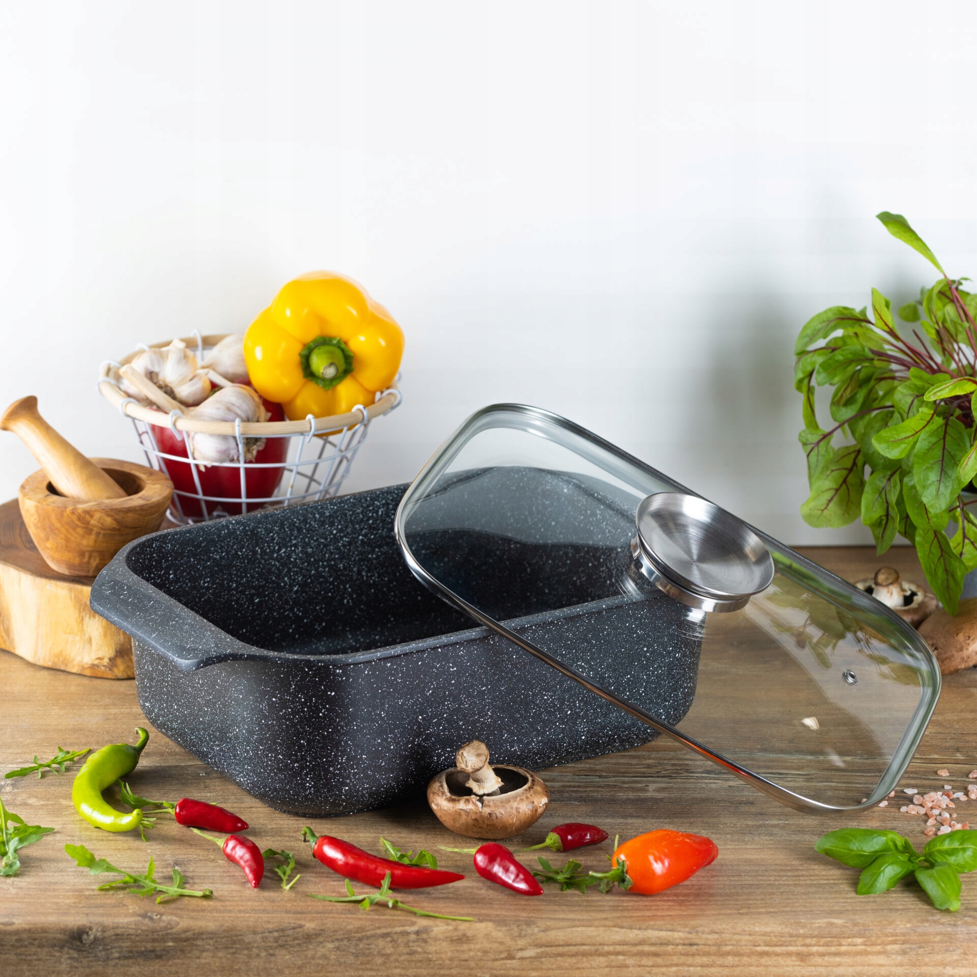 Виготовлені з високоякісного екструдованого алюмінію та покриті мармуровим або гранітним покриттям, стійким до високих температур, гарантують найкращу якість випічки. Жаровні мають кришки із загартованого скла, їжа швидко нагрівається і матеріал добре зберігає тепло.