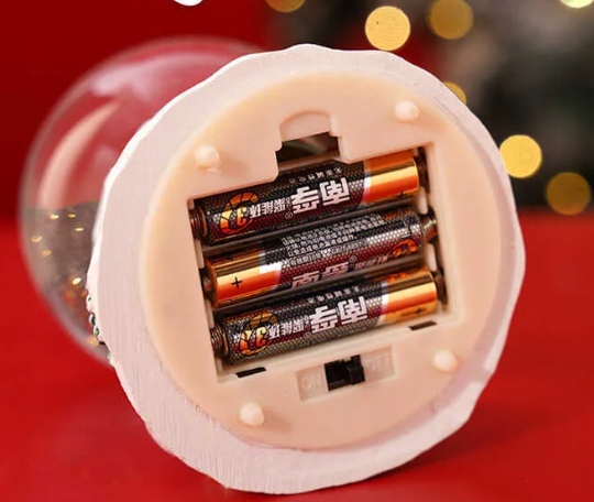 Ялинкова куля на декоративній основі. Куля, наповнена рідиною, в якій плавають штучні сніжинки. Звучить мелодія, світиться різнокольоровим світлом.
