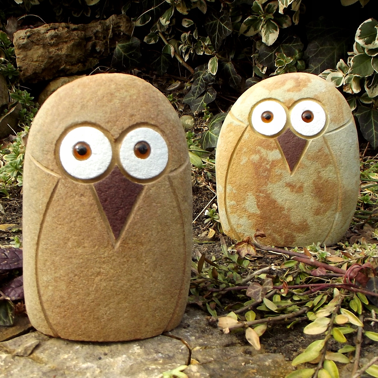 Сова з натурального каменю. Фігурки міцні і стійкі до погодних умов, можуть зимувати на вулиці в саду. Сформовані природою галькові камені роблять кожну сову різною та неповторною. Сови красиво виглядають на балках в альтанках, на гілках, валунах, стінах і рокарії. Очі у сов скляні.