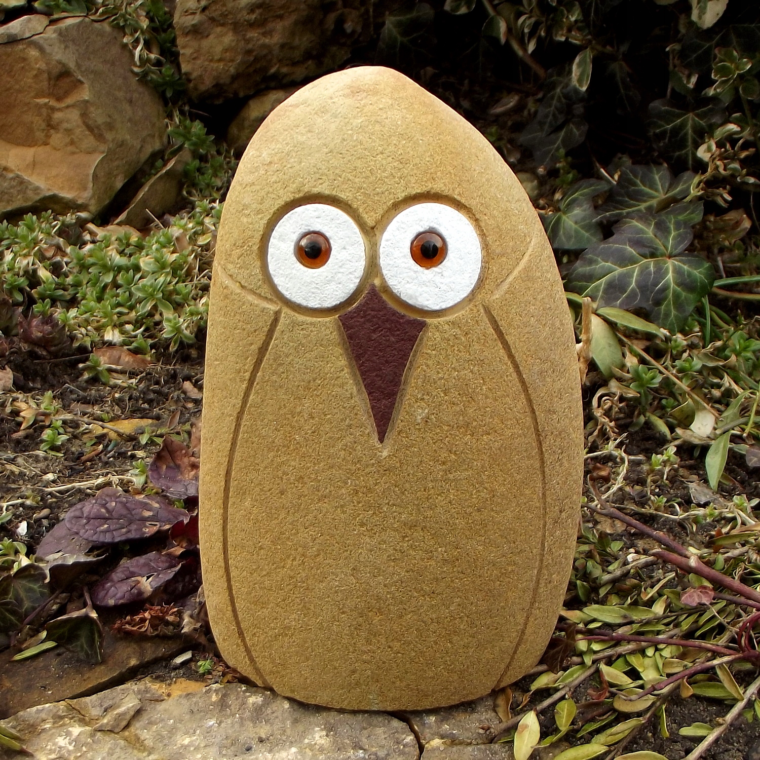 Сови зроблені з природного каменю (Магурський пісковик). Фігурки міцні і стійкі до погодних умов, можуть зимувати на вулиці в саду. Сформовані природою галькові камені роблять кожну сову різною та неповторною. Сови гарно виглядають на балках в альтанках, на гілках, валунах, стінах, рокарії, висота від 15 см до 20 см, вага від 1,5 кг до 3 кг, очі у сов скляні. На інших аукціонах продаються менші сови та багато інших оригінальних фігурок.