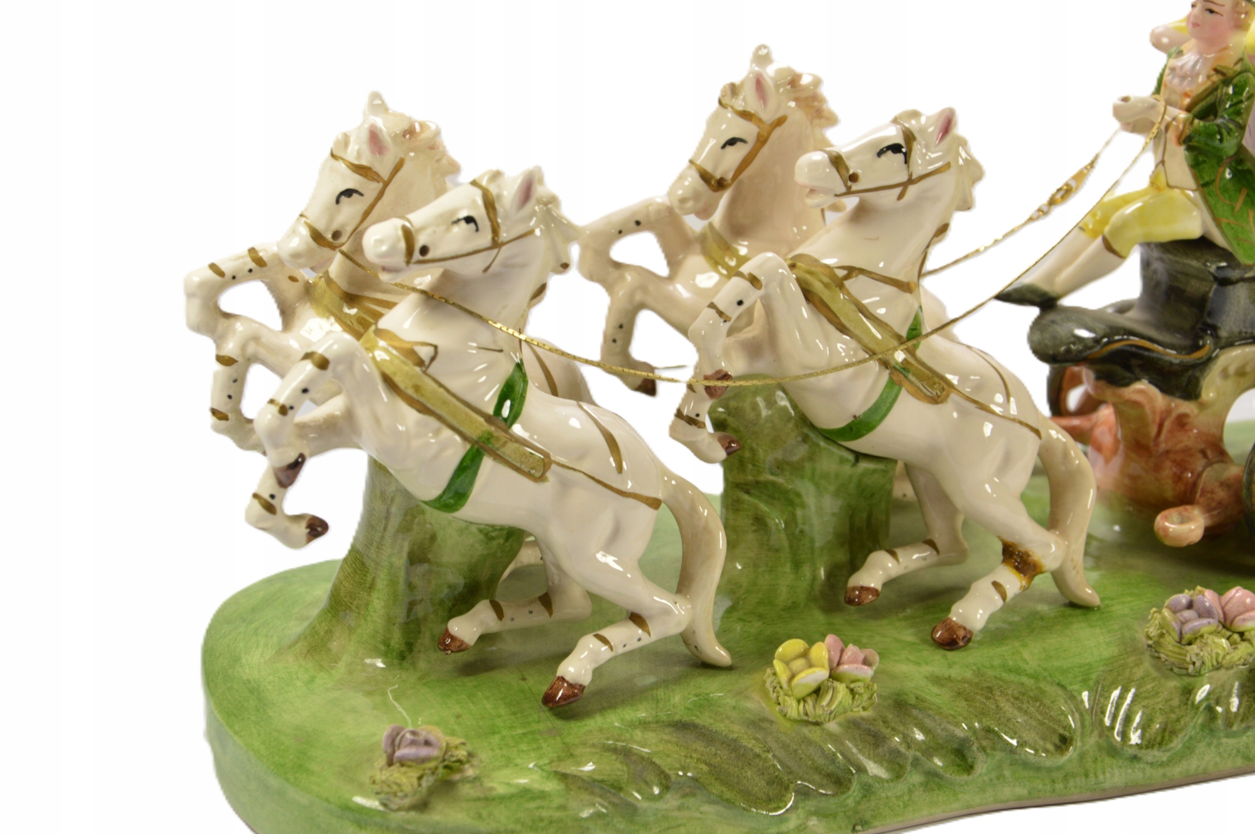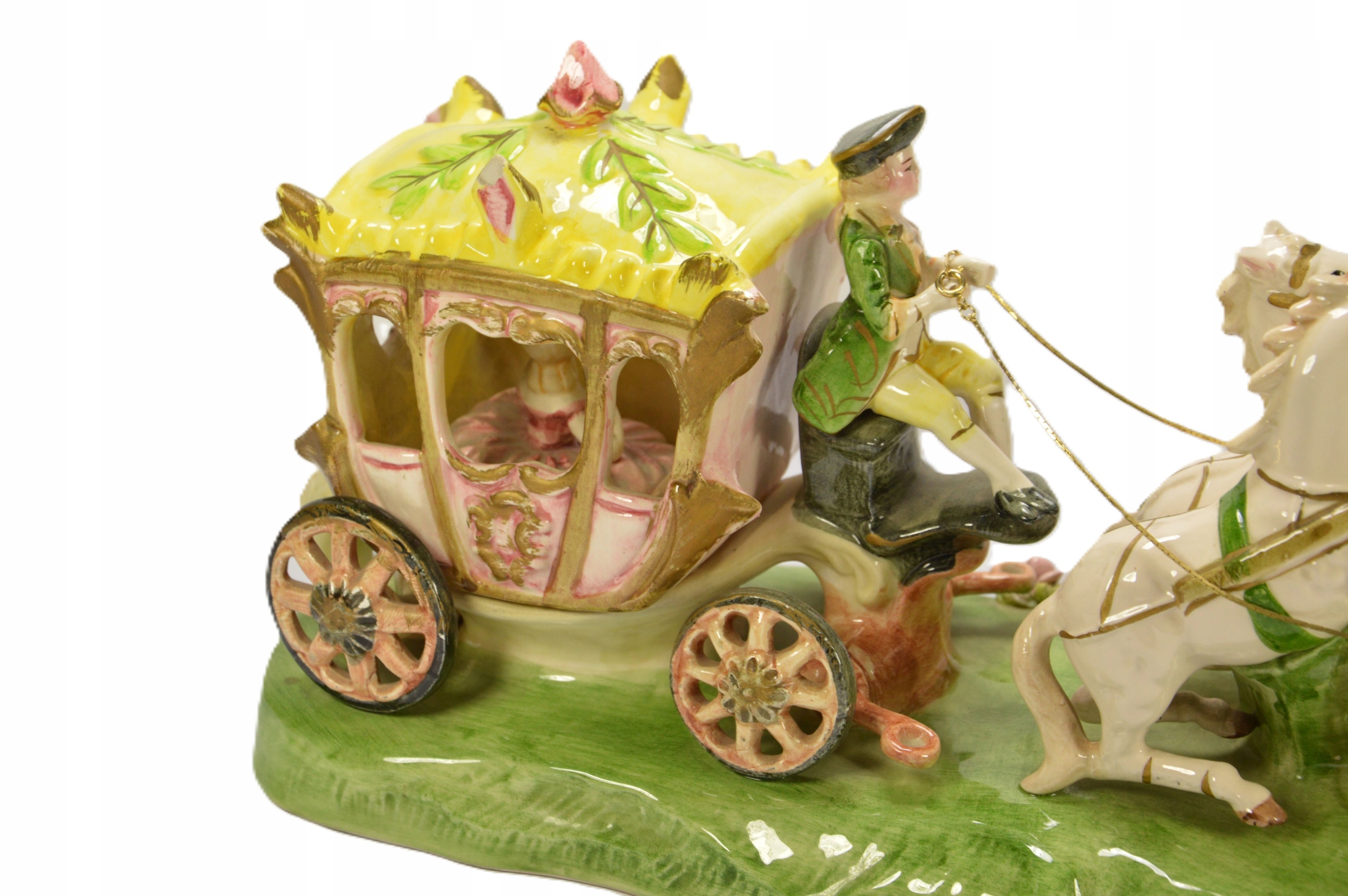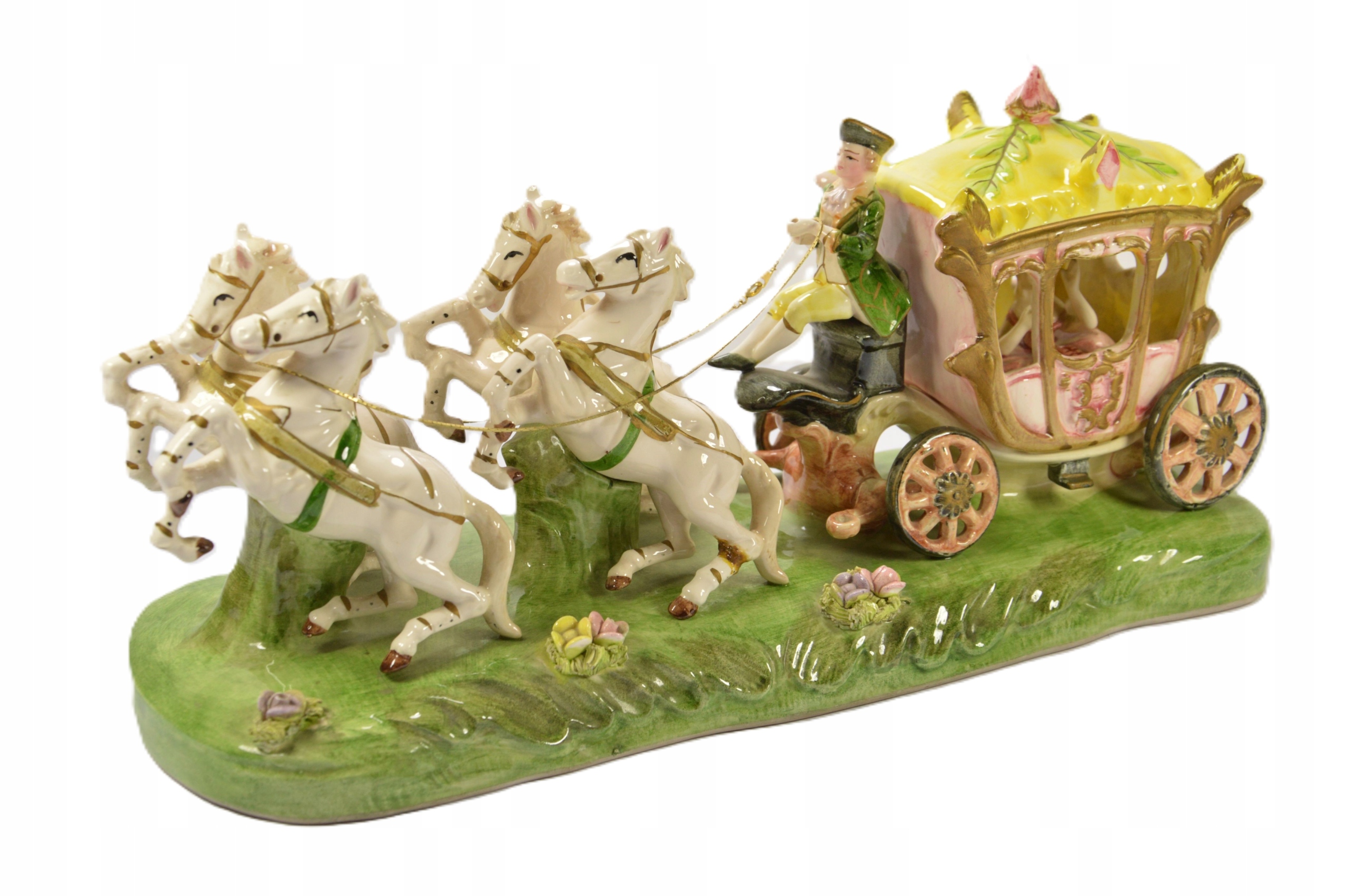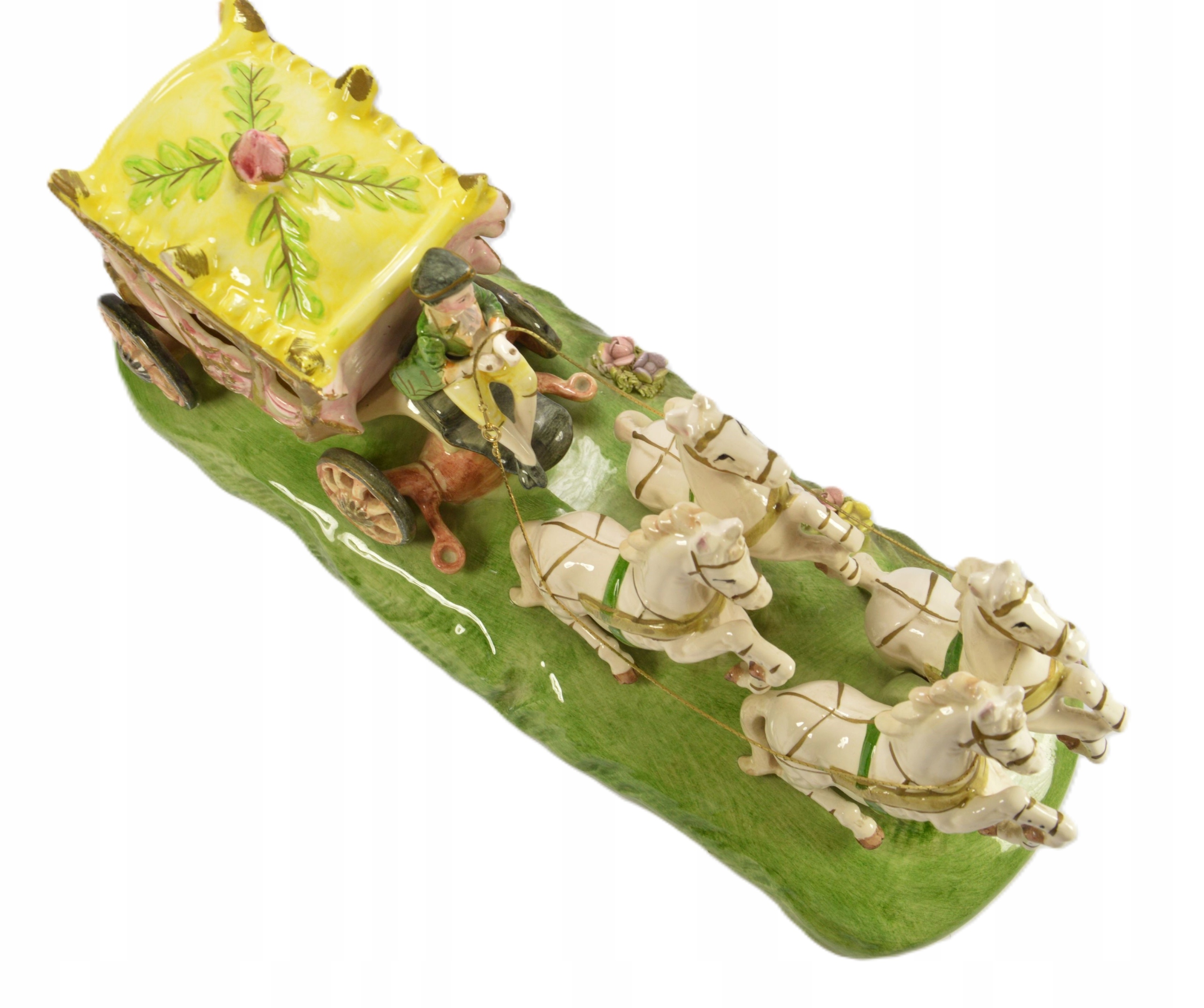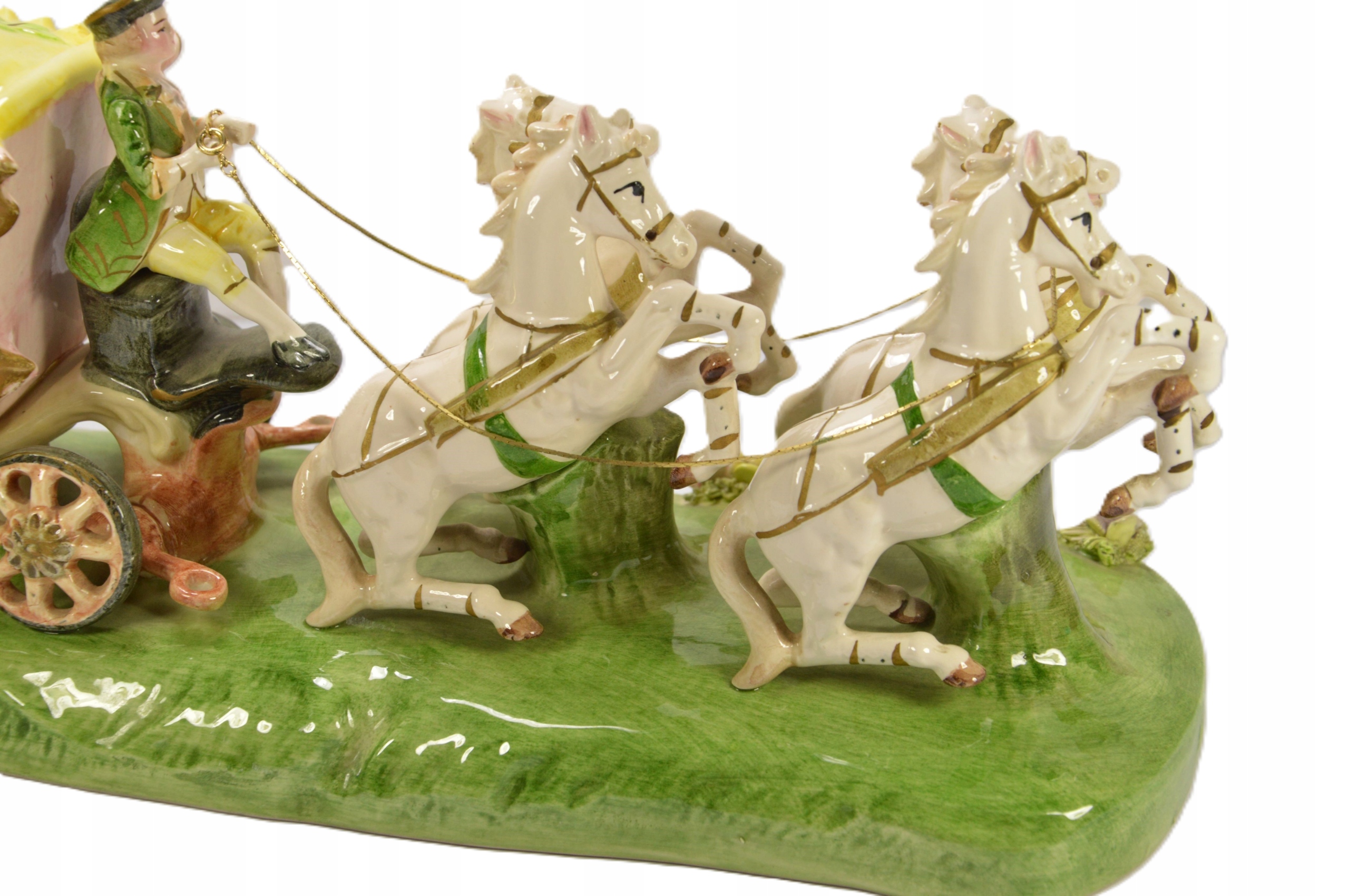 Велика, стара, оригінальна порцелянова статуетка - вагон з конями. Статуетка виглядає чудово, видимо, видимо невеликий, старий ремонт однієї ноги - фото 7 та невеликий сплеск прикраси на даху вагона - фото 2.