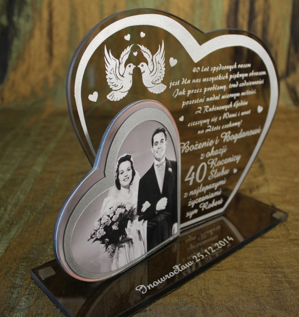 - на основному склі вигравірувані побажання та графічні шаблони, на другому меншому сердечку розміщено фотографію закоханих або річниці