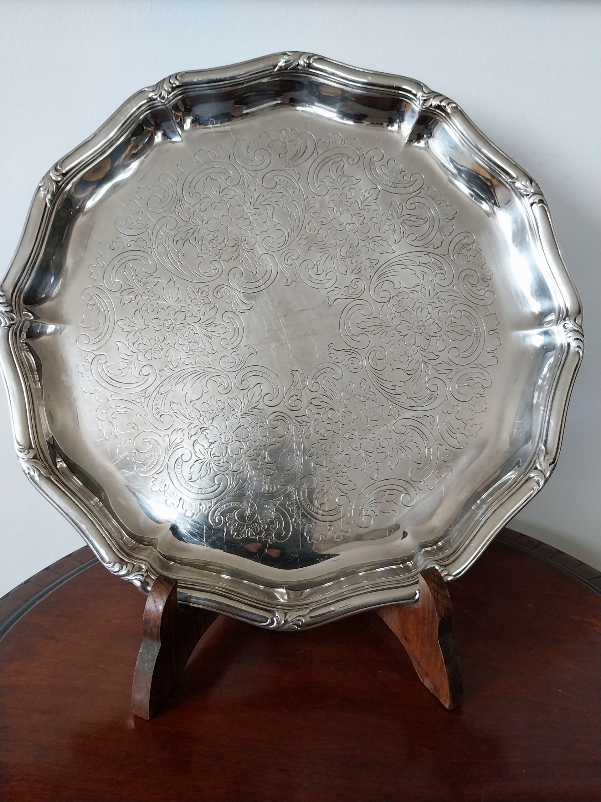 Гарна, багато декорована, посріблена тарілка з монограмою 1960 р. на дні, діаметр 30,5 см, дуже хороший стан, як на фото