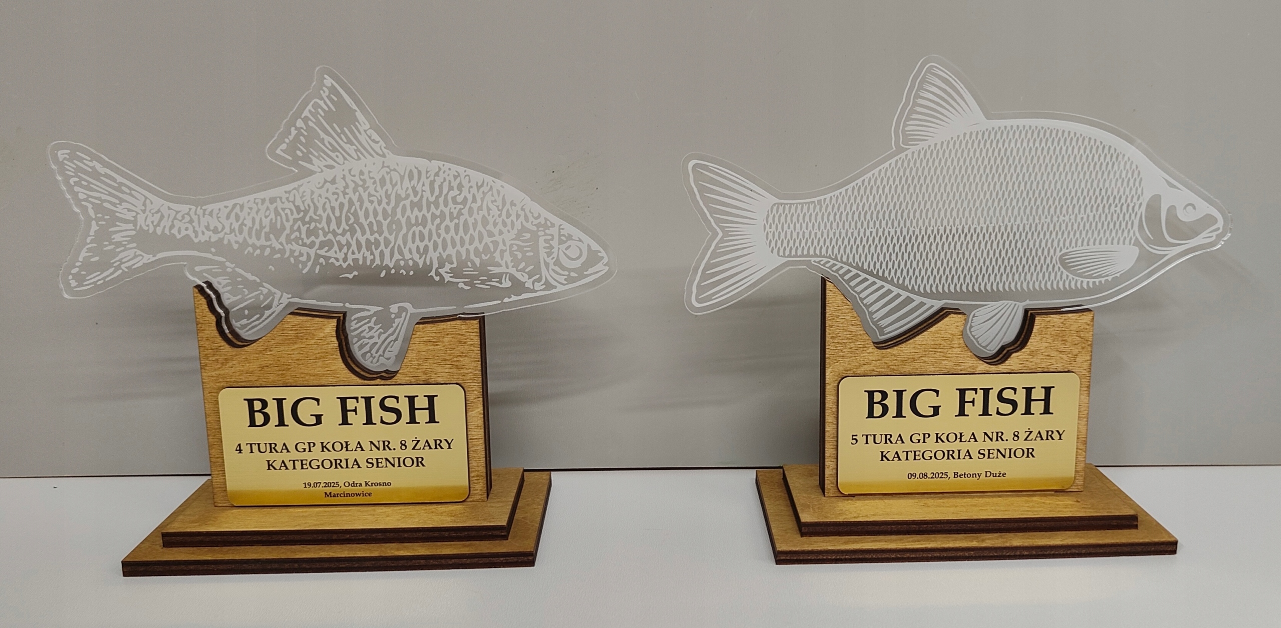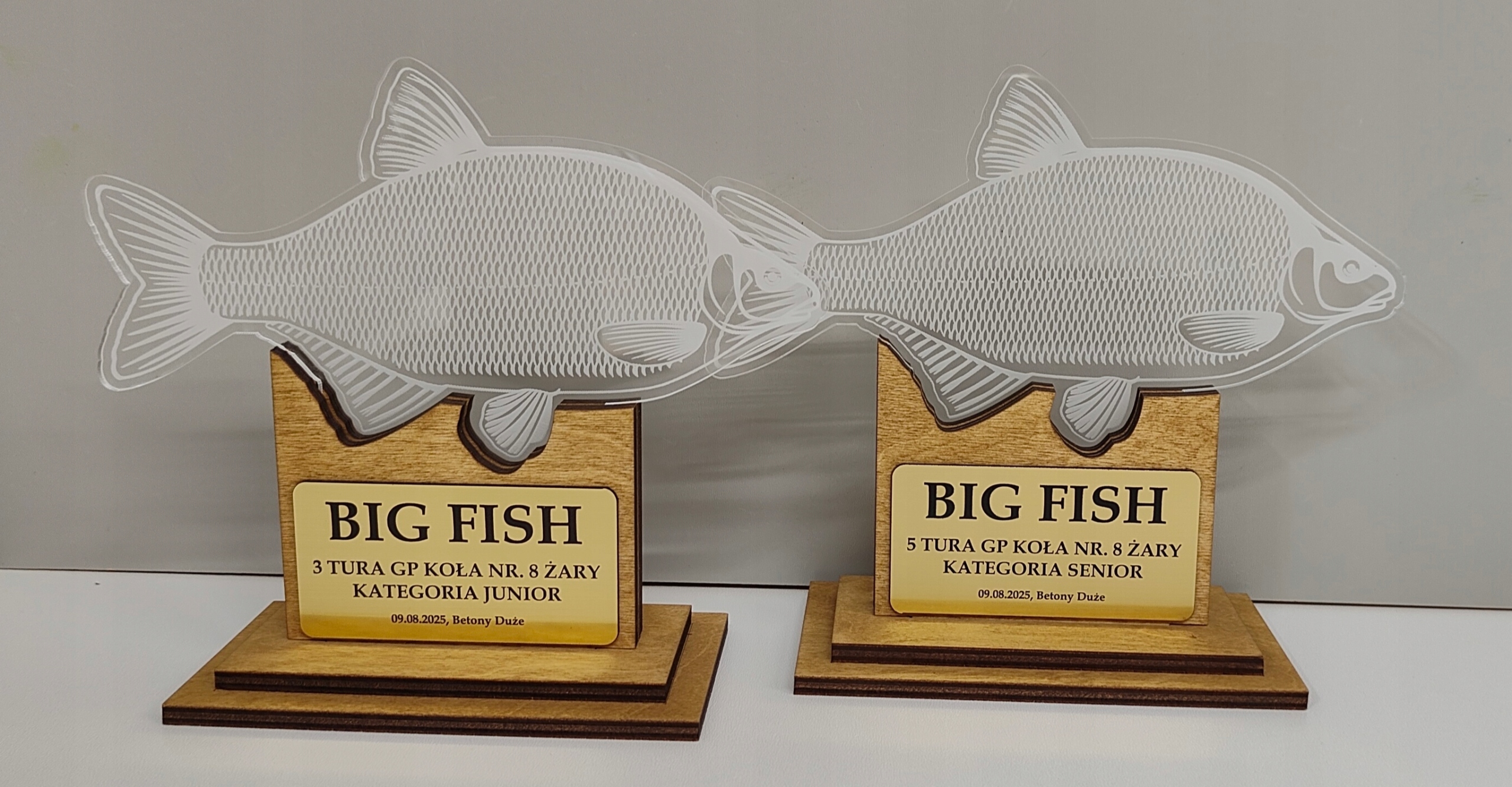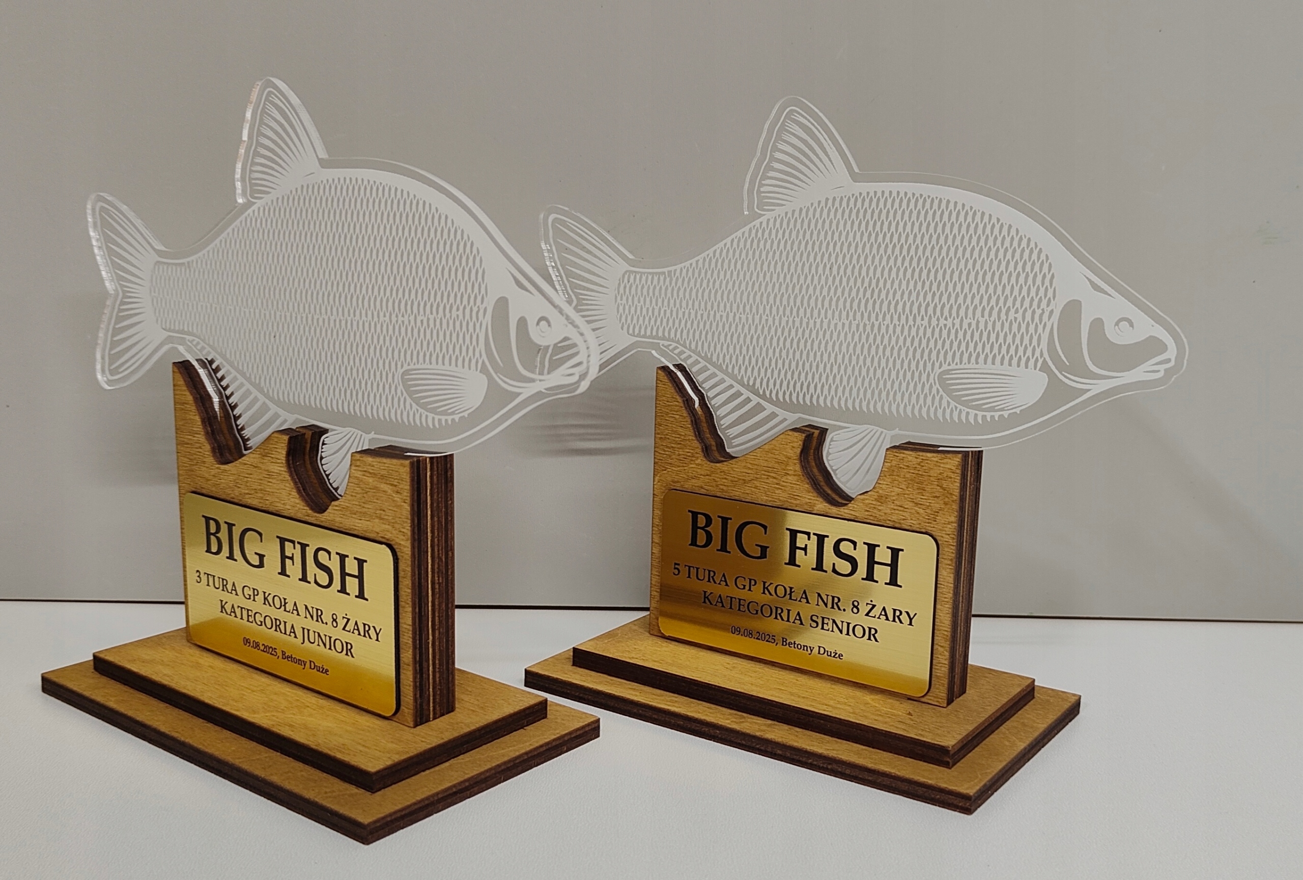 Статуя / трофей для найбільшої риби в змаганнях з риболовлі - BIG FISH. Оригінальна, красива і унікальна статуетка, виготовлена з комбінації фанери та литого оргскла. Крім того, ламінат із золотим гравіюванням завершує все.