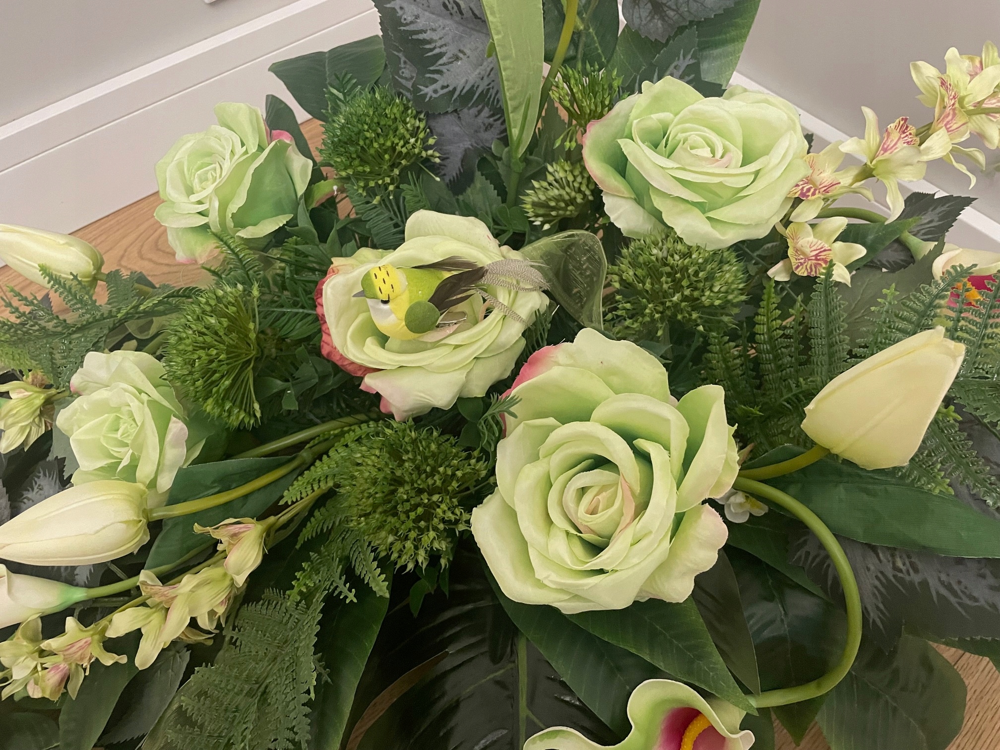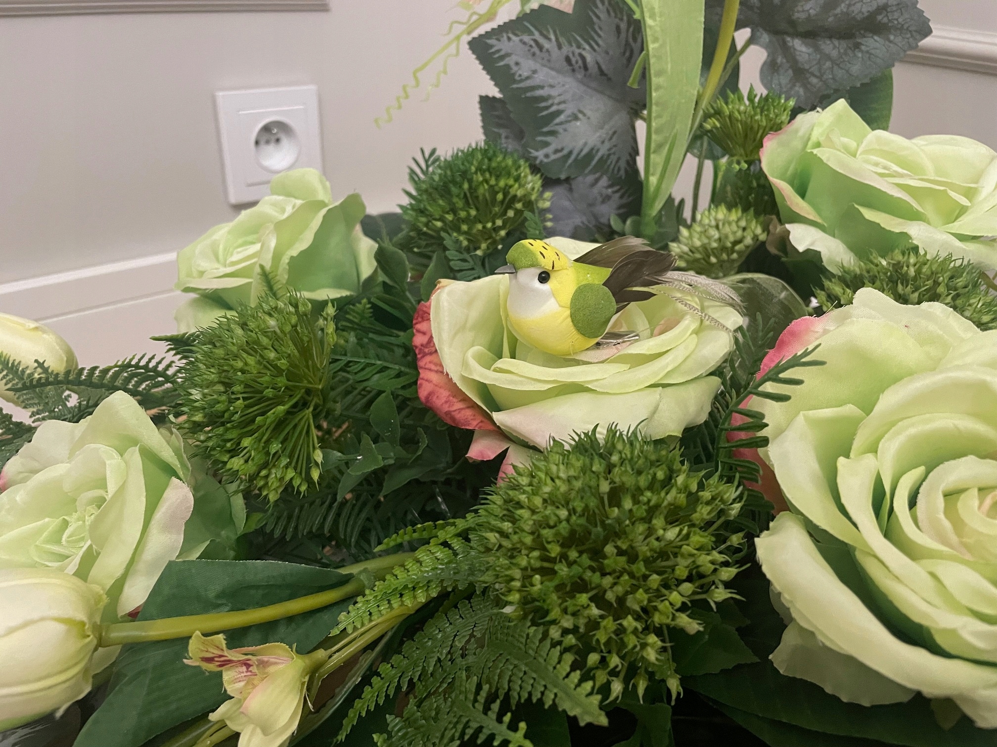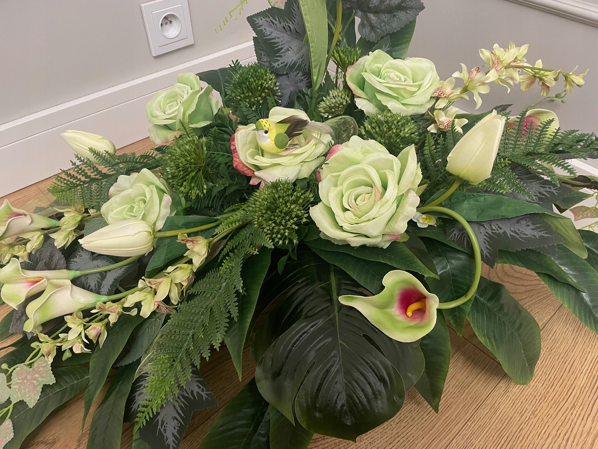 Пропозиція включає гарну композицію на будь-який сезон, виготовлену з дуже якісних штучних квітів.