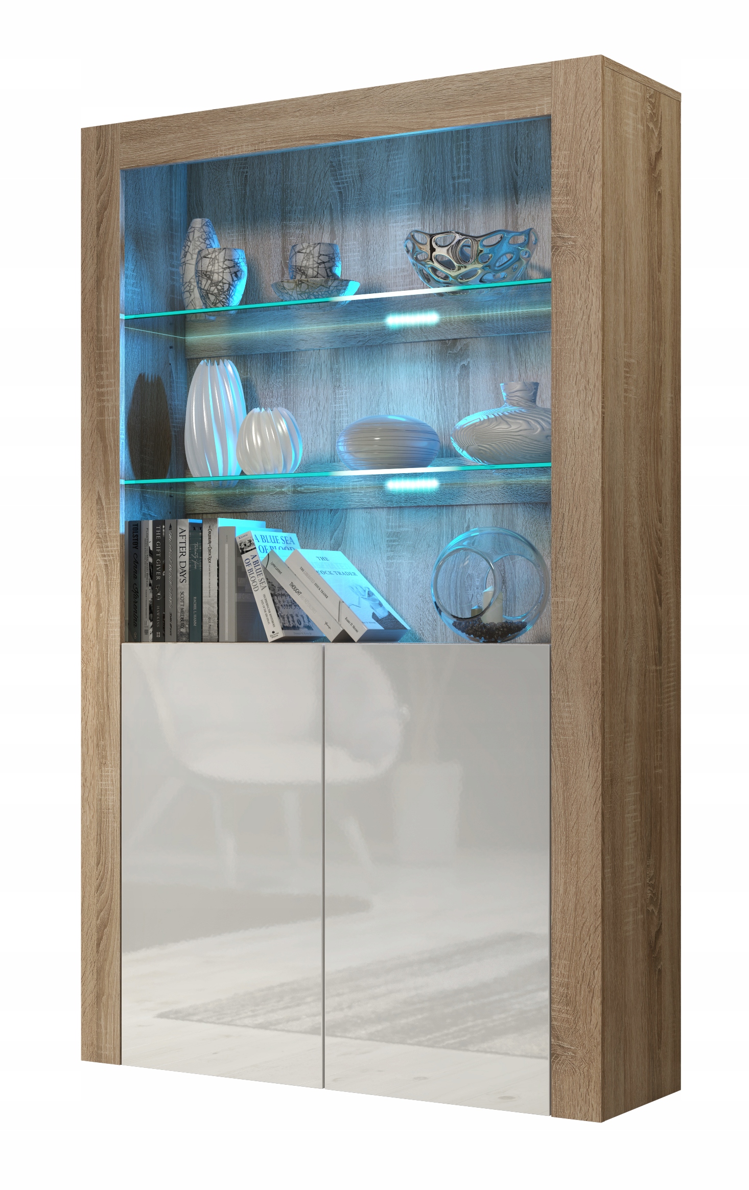 Оригінальний предмет меблів, призначений для розміщення якомога більшої кількості предметів, які ми хочемо завжди мати під своїм розпорядженням на відносно невеликому поверсі. простір у нашому розпорядженні. Він привносить в приміщення шик і трохи свіжості. Це дозволяє використовувати простір по висоті без необхідності свердлити отвори для навісних шаф. Він також може служити вітриною для предметів, які важливі для нас і які ми не хотіли б втратити або знищити. Меблі мають дверцята з глянцевої МДФ плити та відкритий простір, розділений двома скляними полицями. Двері відкриваються за допомогою системи Push to Open. Відкриті стелажі можна додатково підсвічувати світлодіодами, що підкреслить важливість нашої виставки (світлодіодне освітлення не входить). Усі наші меблі доступні в кількох кольорах, тому ми можемо створювати уніфіковані набори або меблеві системи з кількома відтінками.