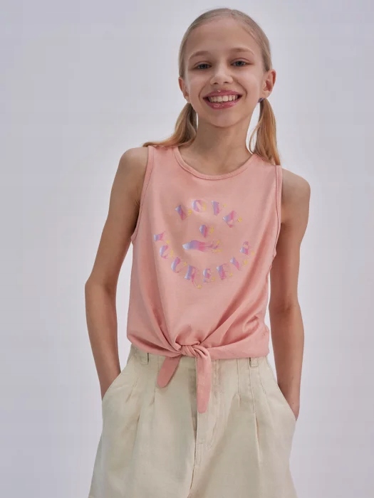 одинока дівчина з бамбукового трикотажного одягу, круглого декольте та пахви, закінчених складом з того ж трикотажного одягу, прикрашеного барвистим принтом та вузлом спереду.
