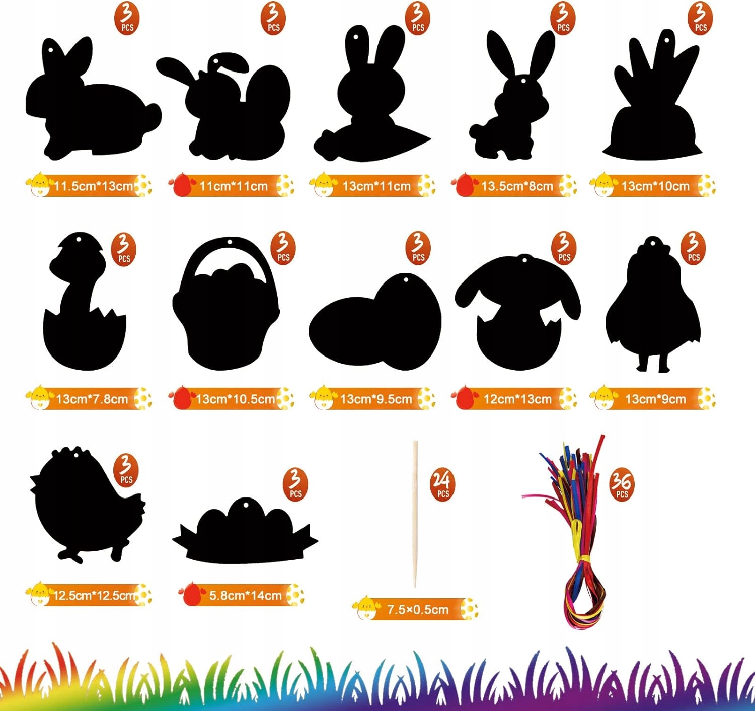 - Пасхальні елементи - 36 аркушів для подряпин (12 конструкцій, 3 для кожного візерунка), 36 струн, 24 палички. До складу візерунків належать зайчики, пташенята та писанки, кошики тощо