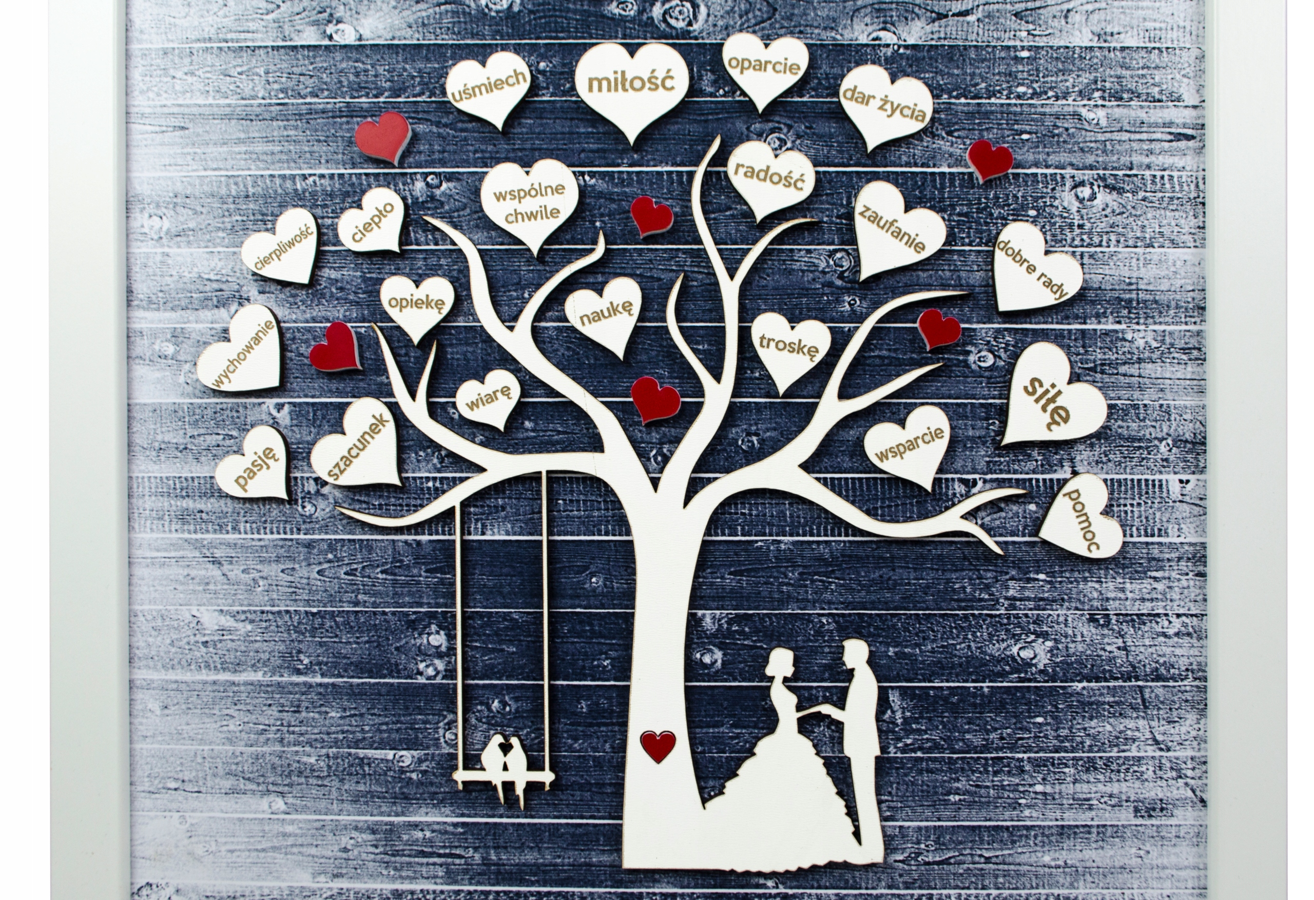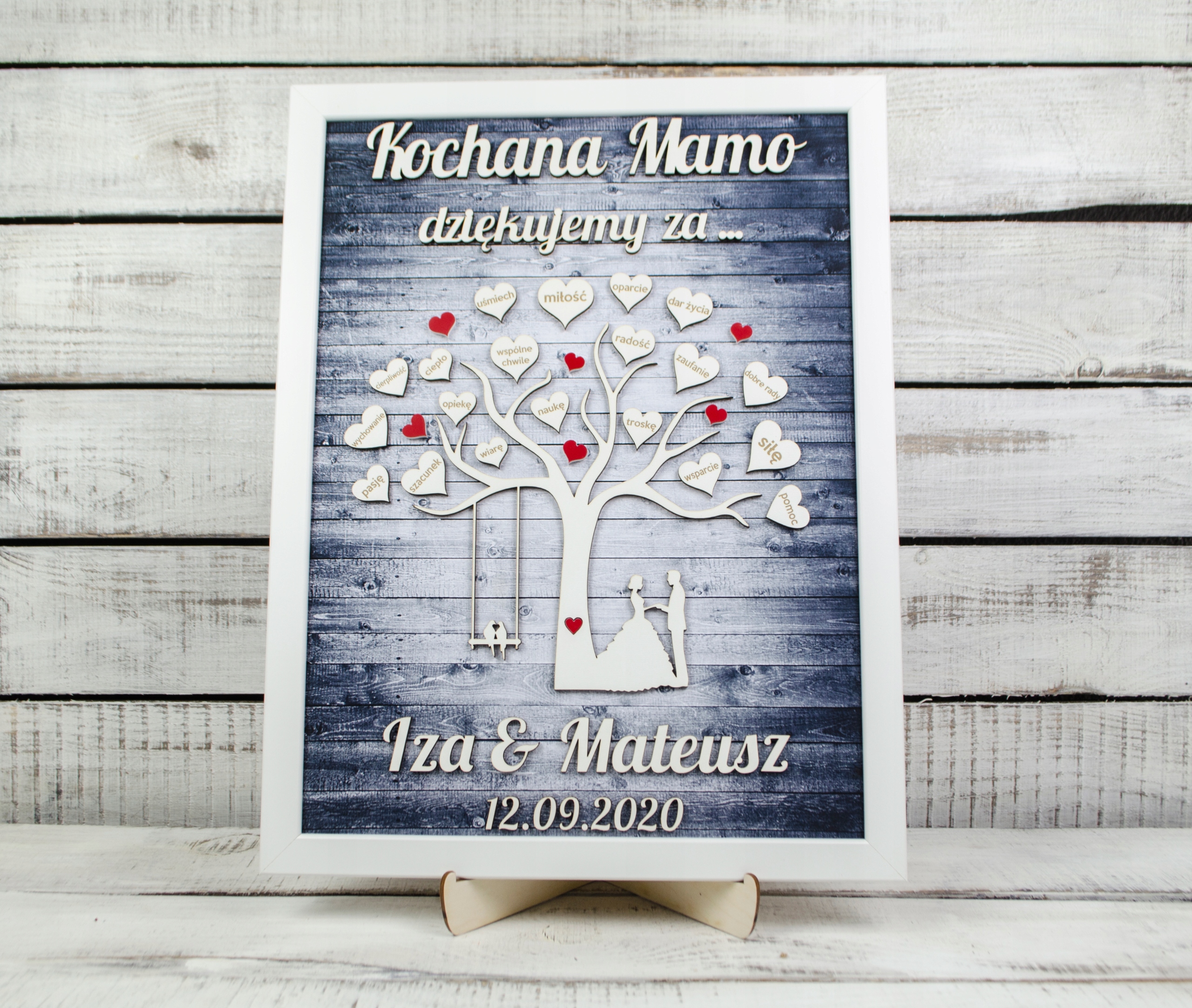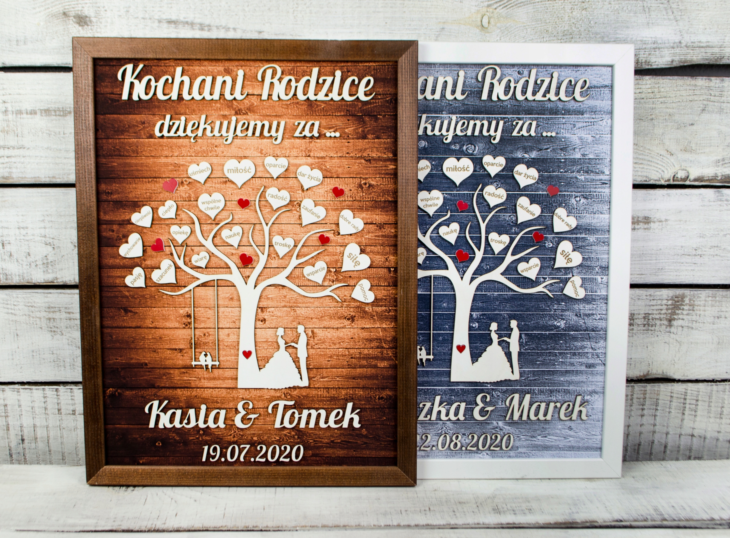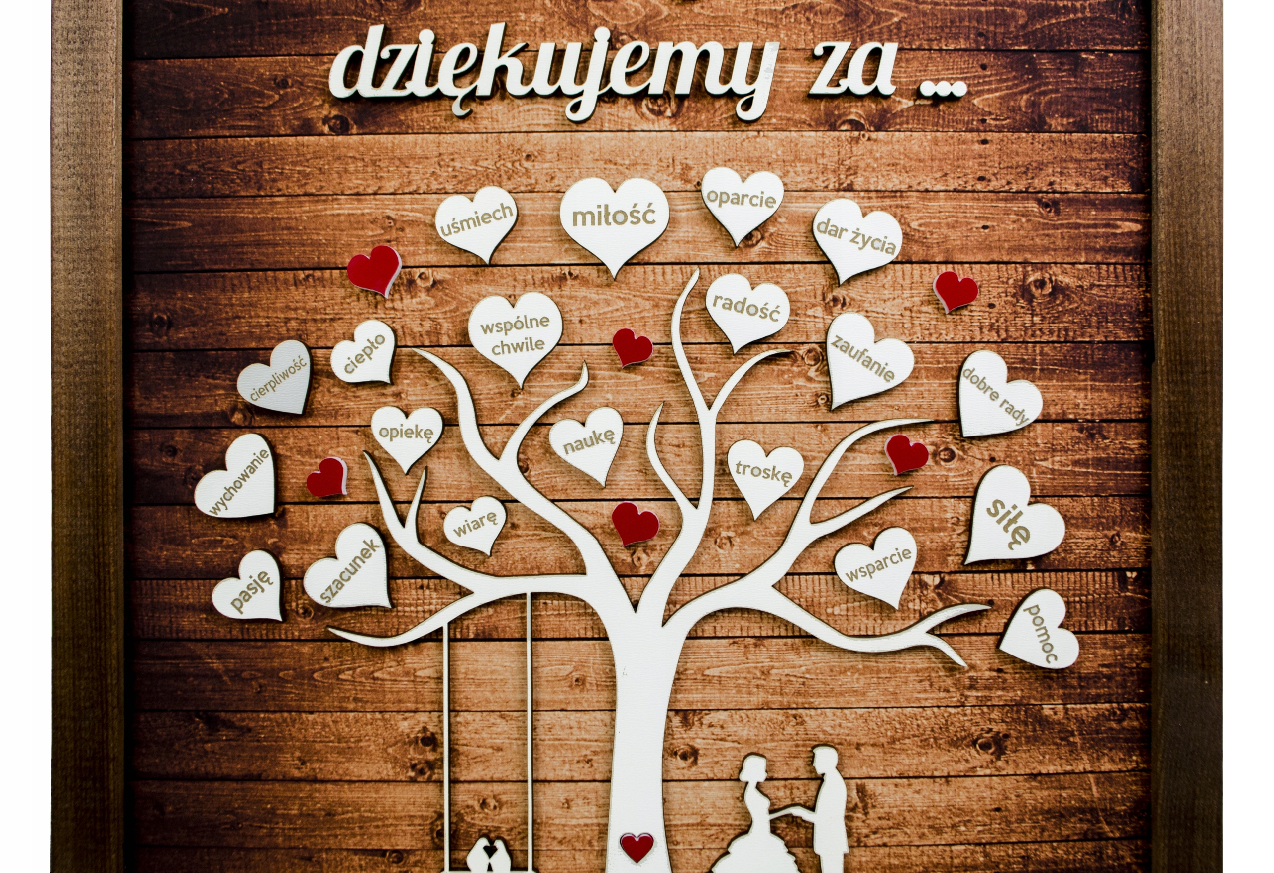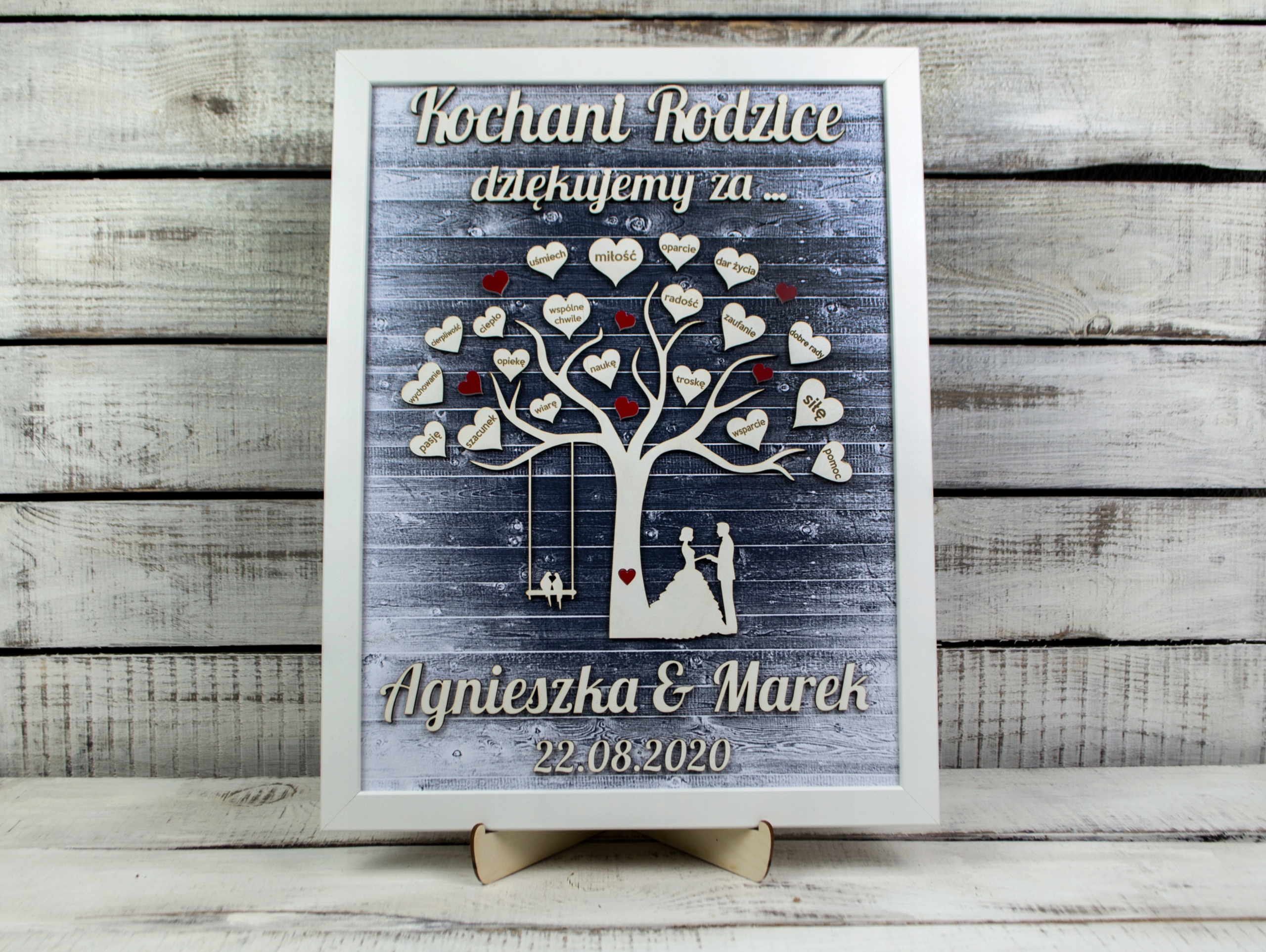 На дерев'яній дошці, окрім дати та імен нареченого та нареченого, є 20 вигравіруваних сердець з оригінальними присвятами. Така подяка батькам буде не тільки зворушливим сувеніром, а й використовуватиметься як естетична прикраса інтер'єру.