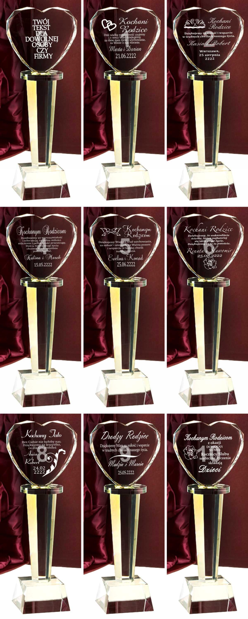 Не можете вирішити, який подарунок вибрати як подяку батькам? Збираєтеся на сімейне свято і не знаєте, що купити імениннику? Купіть цю статуетку! Це кришталева статуетка у формі серця на колоні з красивим бордовим корпусом. Він має поліровані боки та краї, щоб виглядати ще красивіше. Товщина кристала 19 мм! Він також дуже високий - майже 27 см. Крім того, він вигравіруваний на високоякісному лазерному плотері, а гравірування вручну і дуже акуратно заповнюється майстром спеціальною фарбою. Позолота/срібло переливається, якщо тримати його проти світла, і дає дивовижний ефект. Все доповнюється гарним бордовим футляром із бордовим атласом, у якому статуетка виглядає ще красивіше, а золото виділяється.