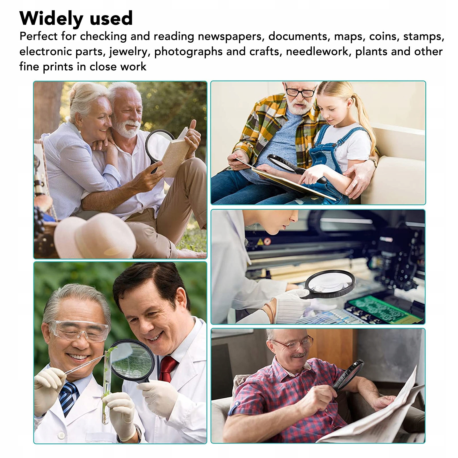 2. Широкий спектр застосувань: лупа ідеально підходить для тестування та читання газет, документів, карт, монет, марок, електронних деталей, прикрас, фотографій та артефактів, голкових мистецтв, рослин та інших маленьких відбитків у тісній роботі.