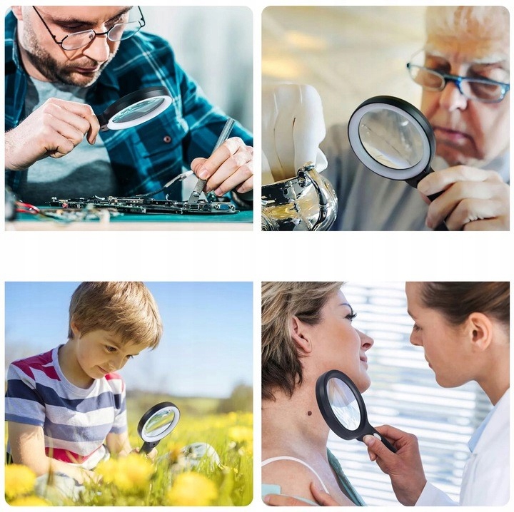 Велика 10-кратна лупа з 18 світлодіодним підсвічуванням — це продукт, який має широкий спектр застосування в різних сферах. Завдяки двом пропонованим збільшенням (10-кратне збільшення) і вбудованим світлодіодам, він ідеально підходить для читання як удень, так і вночі.