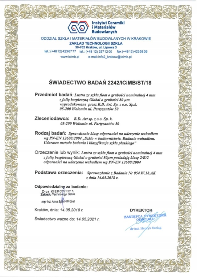 Наші дзеркала мають сертифікат випробування Інституту кераміки та будівельних матеріалів. Це сертифікат, який підтверджує ударостійкість наших дзеркал завдяки безпечній фользі, яка використовується на задній частині дзеркала. Коли дзеркало пошкоджене/розбите, скло утримує захисна плівка. Дзеркало не розсипається і не завдає травм.