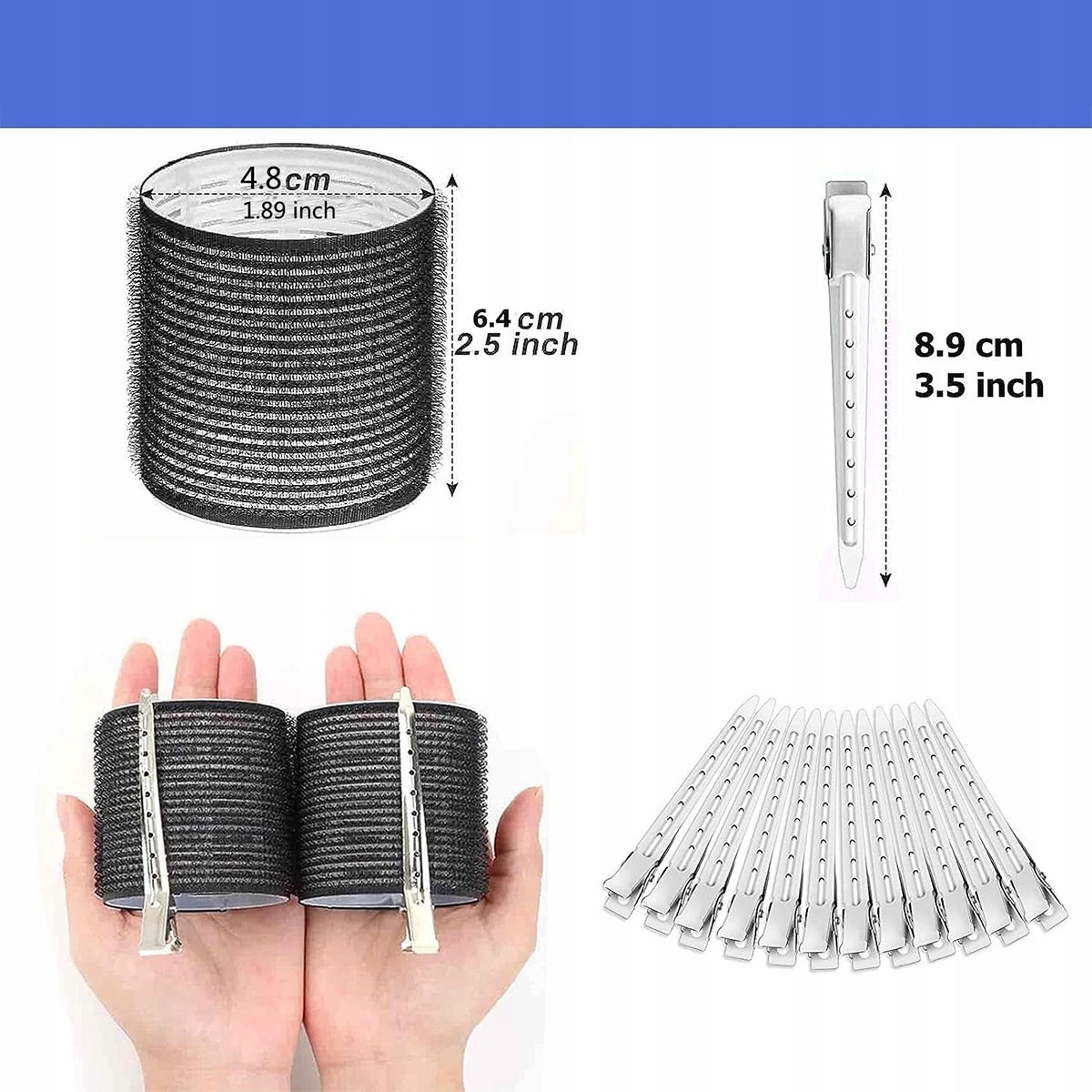 Самоклеючі ролики містять 12 частин великих чорних роликів діаметром прибл. Шпильки у формі качиного дзьоба, діаметром 48 мм, 12 штук, виготовлені з нержавіючої сталі. дозволяє створити локони будь-якого розміру, підняти їх і збільшити об'єм. Його можна використовувати для створення хвиль, ретро-локонів, чубчика та інших форм чубчика або кінчиків волосся.