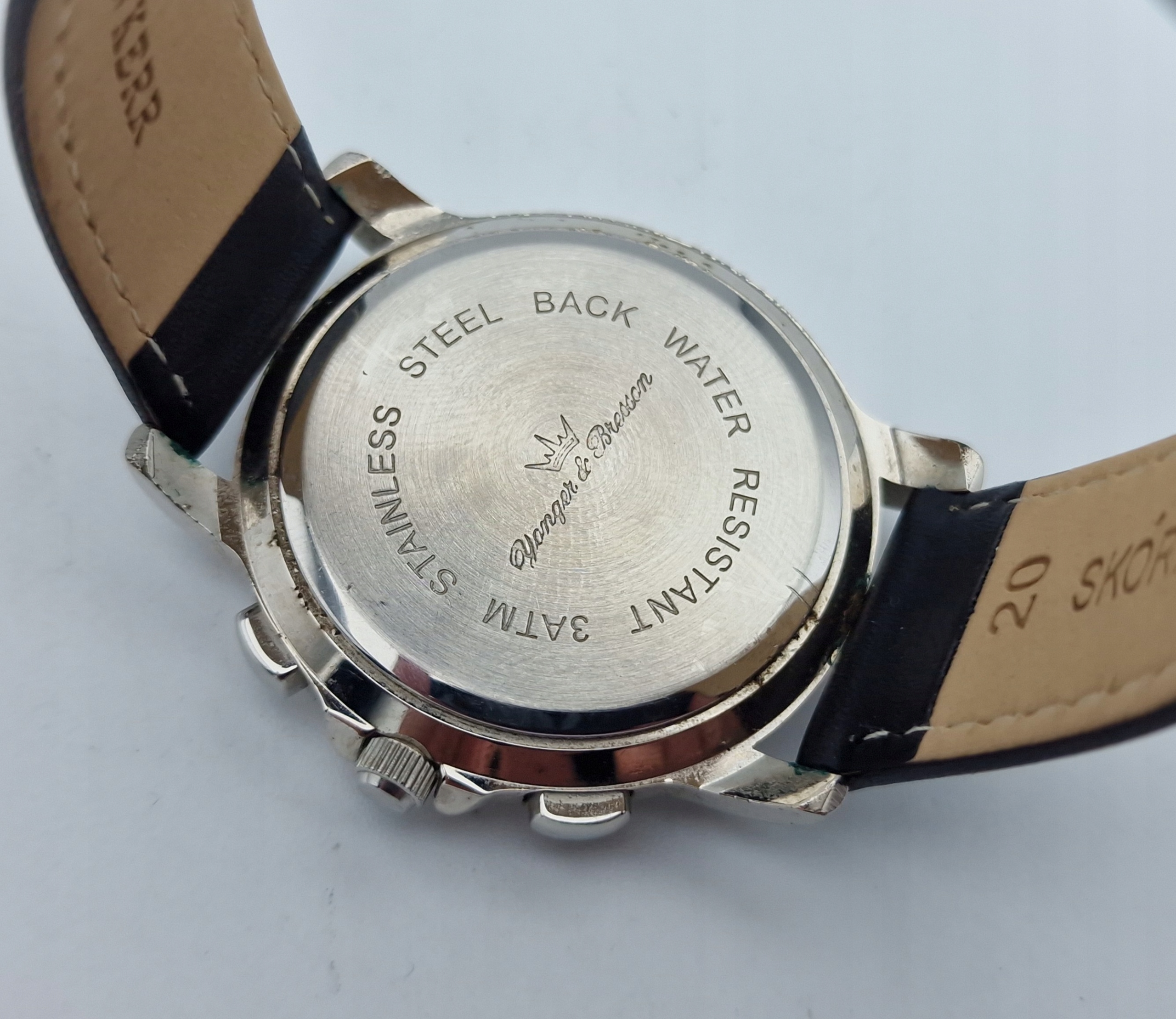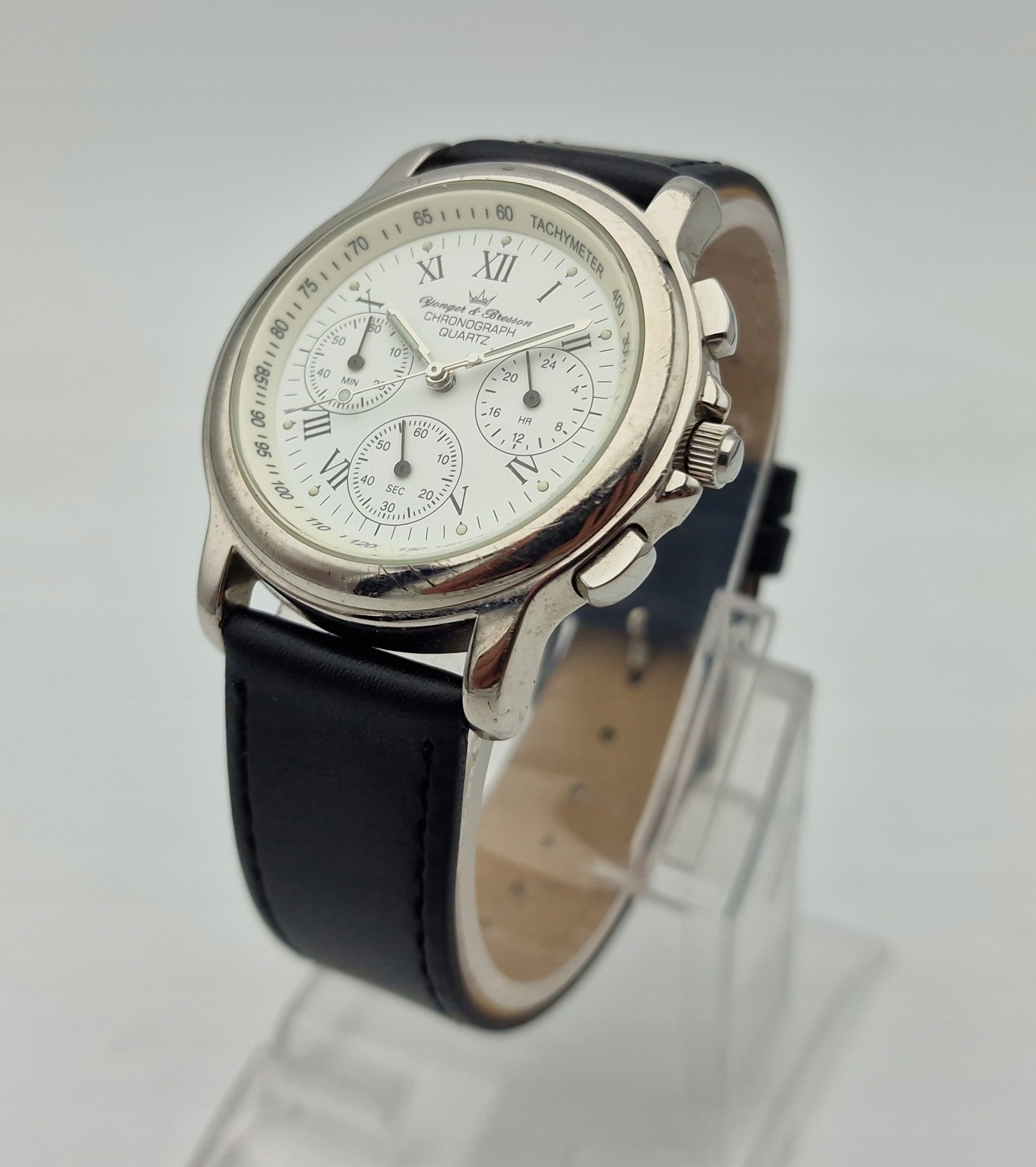 - Білий щит із секундором та срібними мітками. Оригінальний щит, підписаний: " Yonger & Bresson, Quartz, Chronograph ". Щит у ідеальному стані, показаний на знімках.