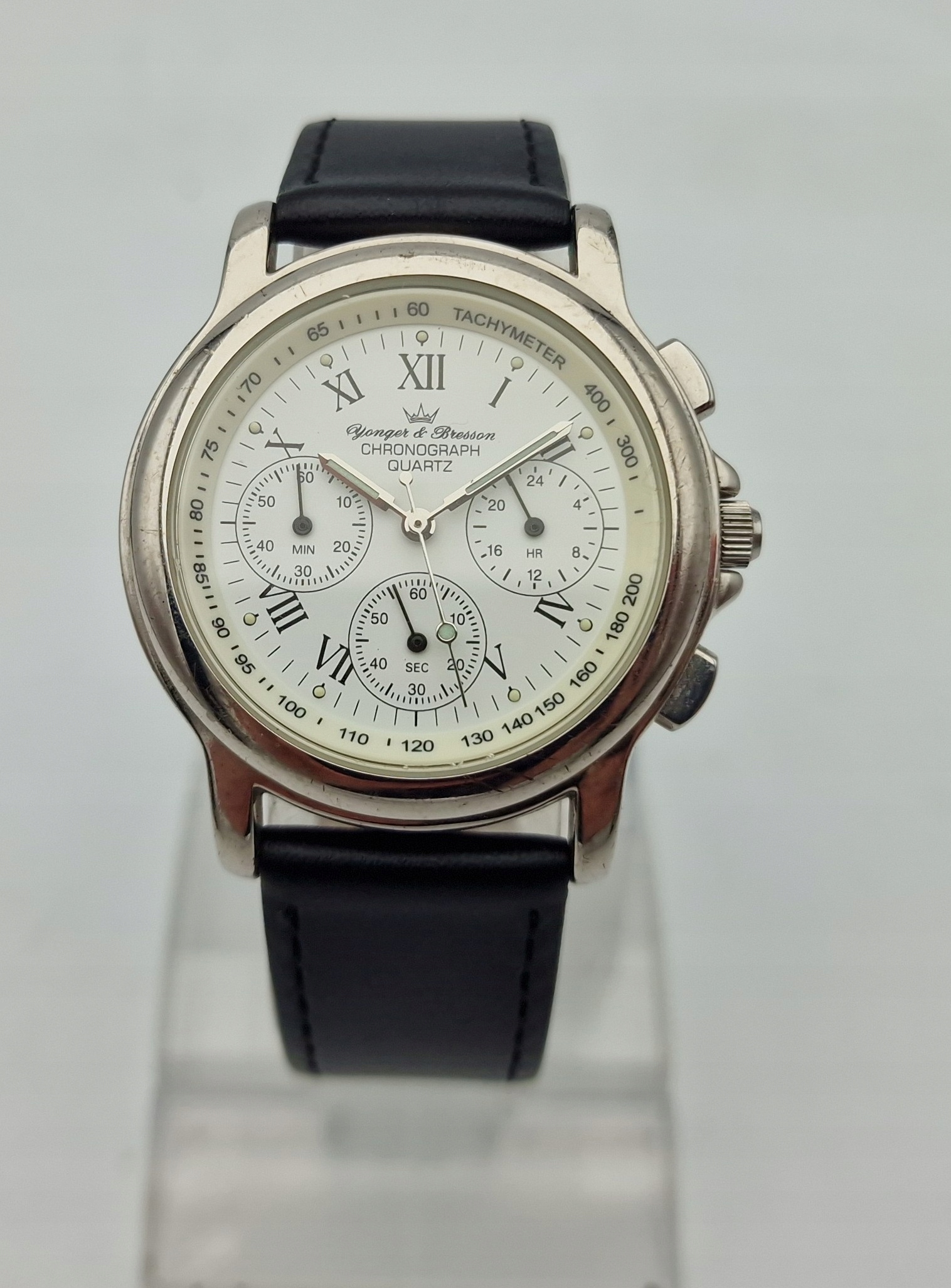 - Білий щит із секундором та срібними мітками. Оригінальний щит, підписаний: " Yonger & Bresson, Quartz, Chronograph ". Щит у ідеальному стані, показаний на знімках.