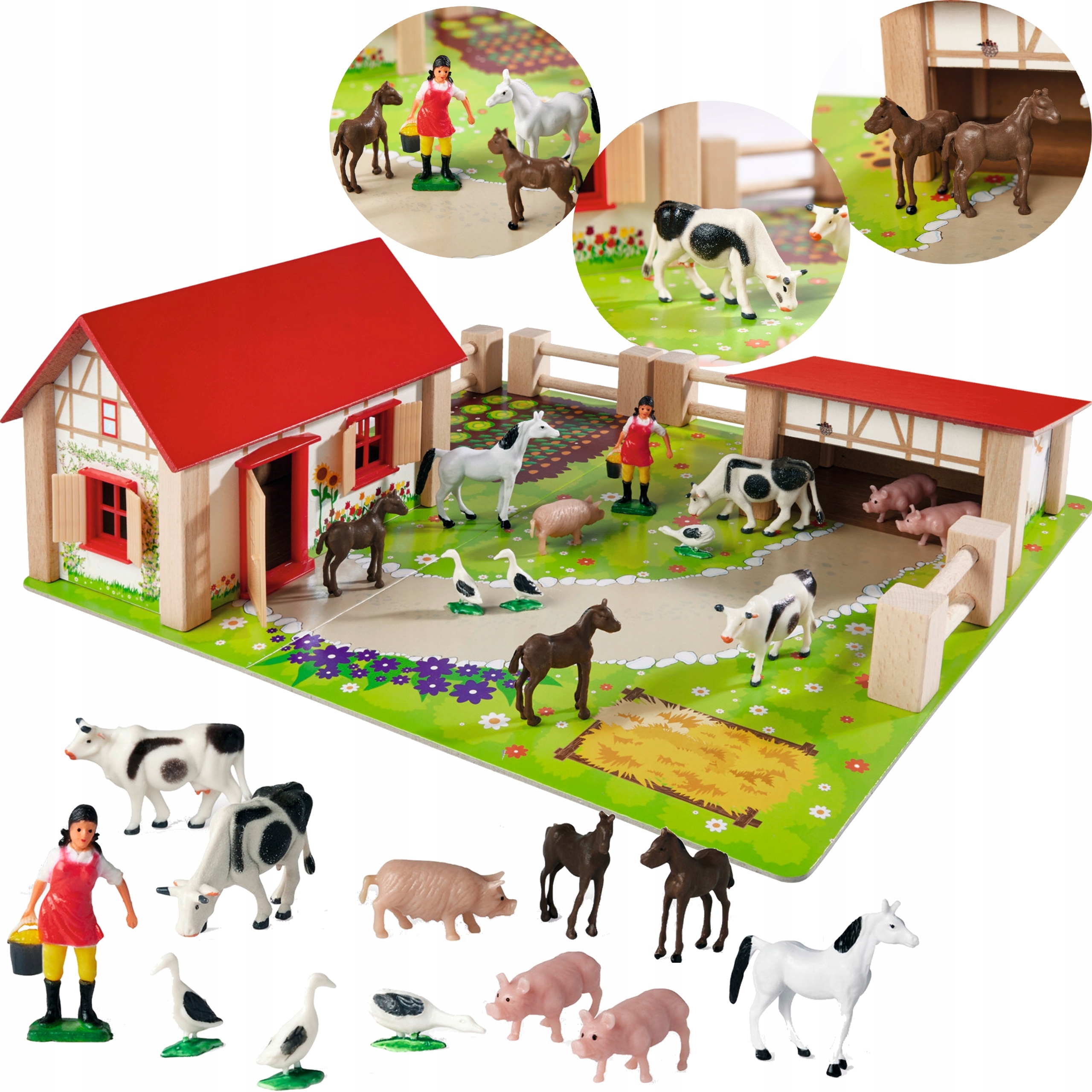 Чудовий фермерський будинок із червоним дахом, дверима та вікнами, що відчиняються та стайня змусить вашу дитину відчути себе у справжньому селі.