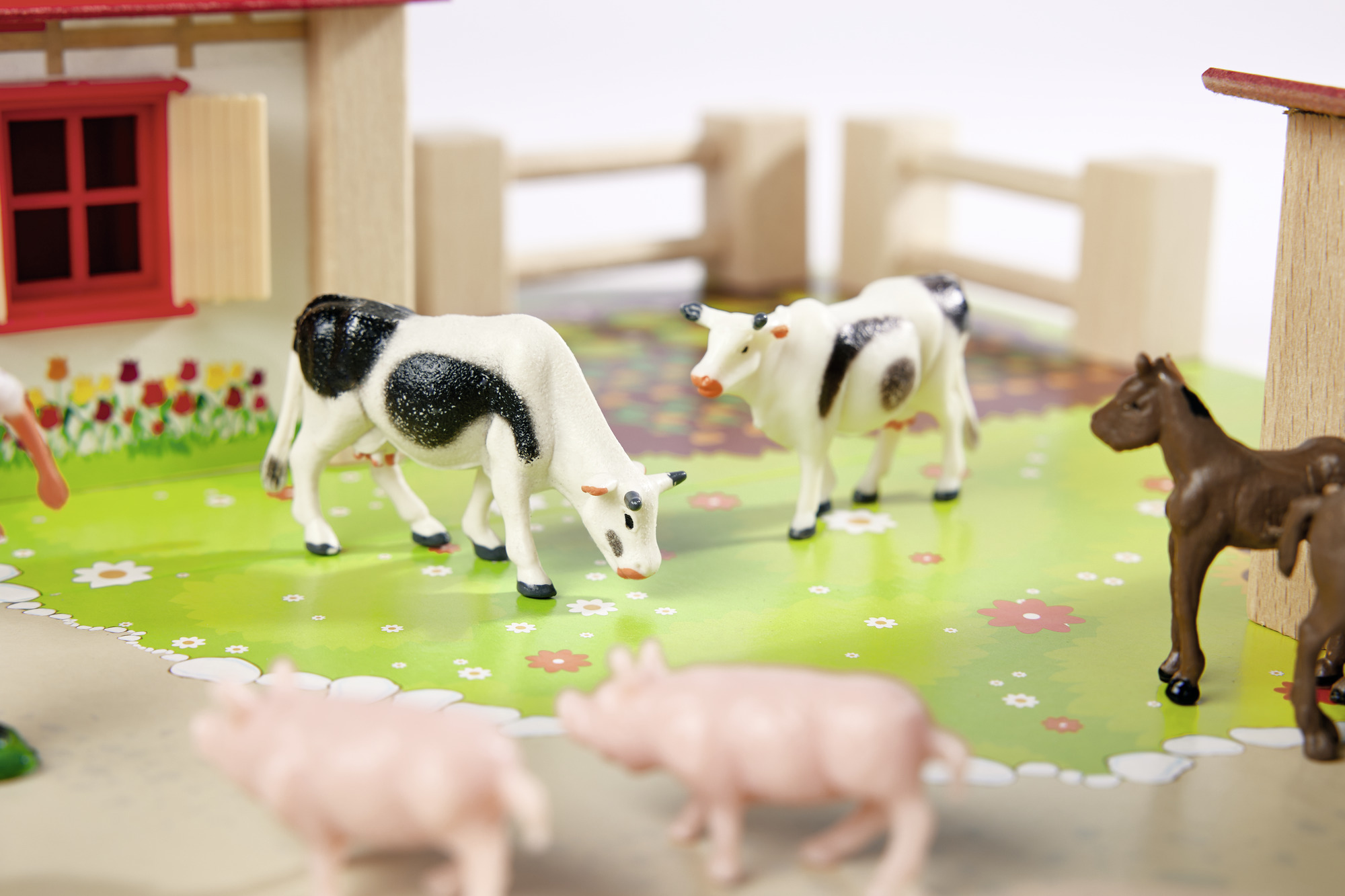 В набір також входять: барвистий ґрунт, що імітує доріжку, траву та город, паркан та наклейки (в тому числі дерева , рослини, тварини) для прикраси будинку та стайні.
