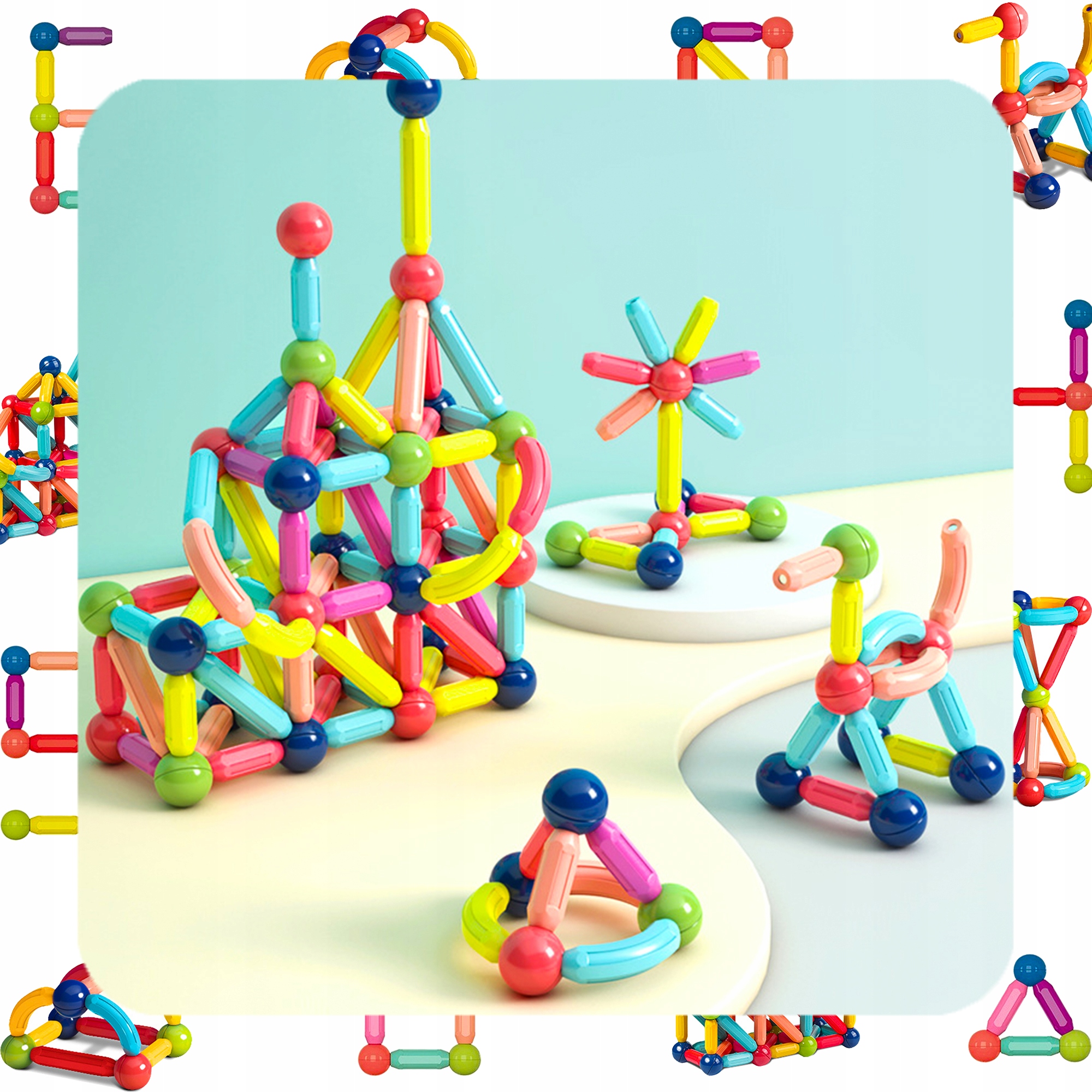 - М'ячі: базові елементи будівельні деталі, які служать з’єднувачами для паличок, що дозволяє будувати складні конструкції. , які додають динаміки конструкціям, що будуються.